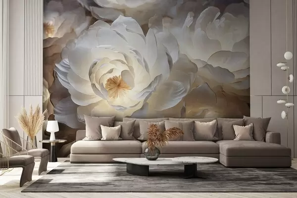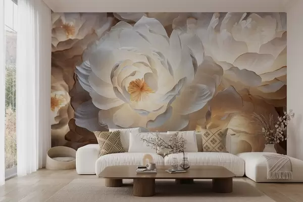 Fototapet Stora, vita fantasifulla pionblommor med gula centrum, mjuk belysning och delikata, texturerade lager av kronblad Nr. w09550