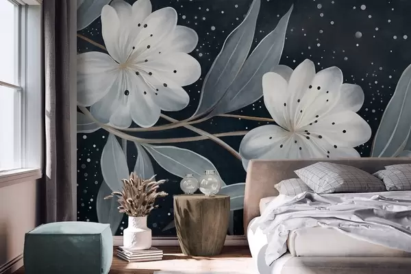 Fototapet Fantasi texturerade vita blommor, omgivna av blågröna blad och grenar mot en mörk bakgrund Nr. w09551