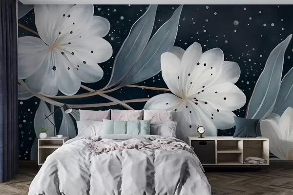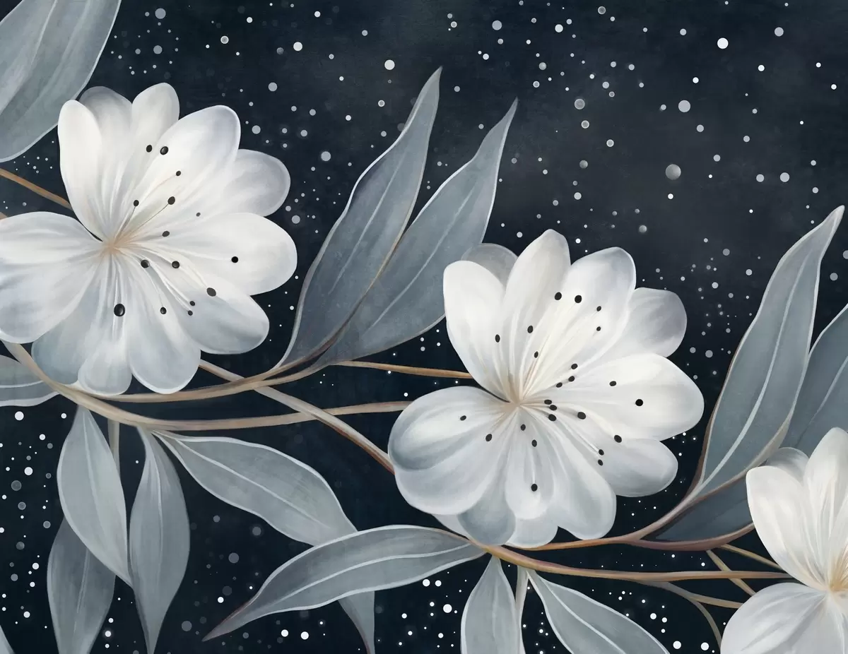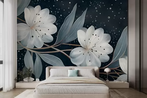 Fototapet Fantasi texturerade vita blommor, omgivna av blågröna blad och grenar mot en mörk bakgrund Nr. w09551