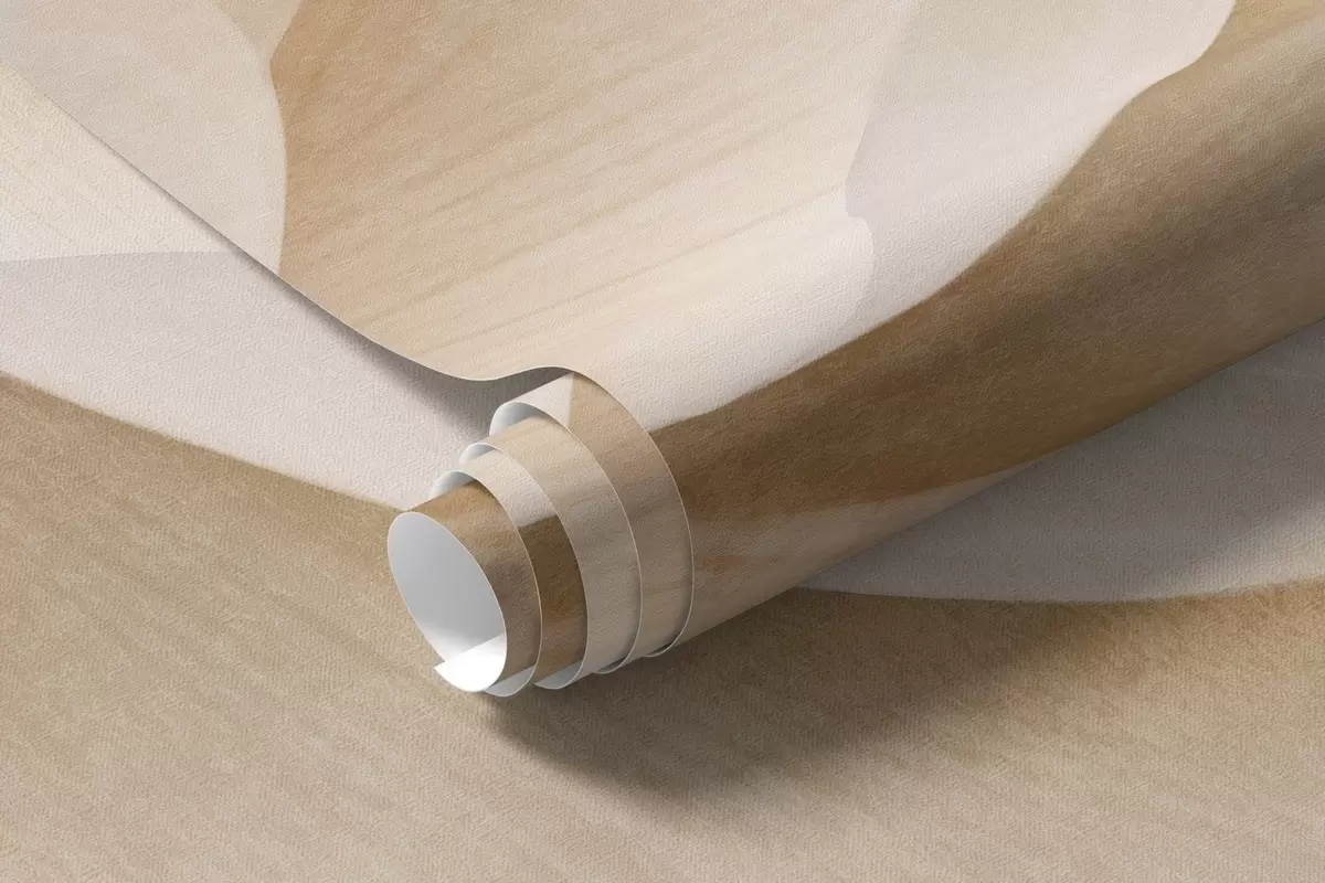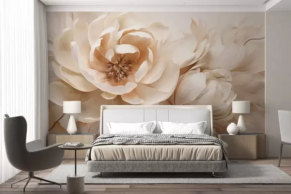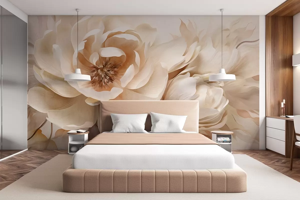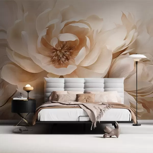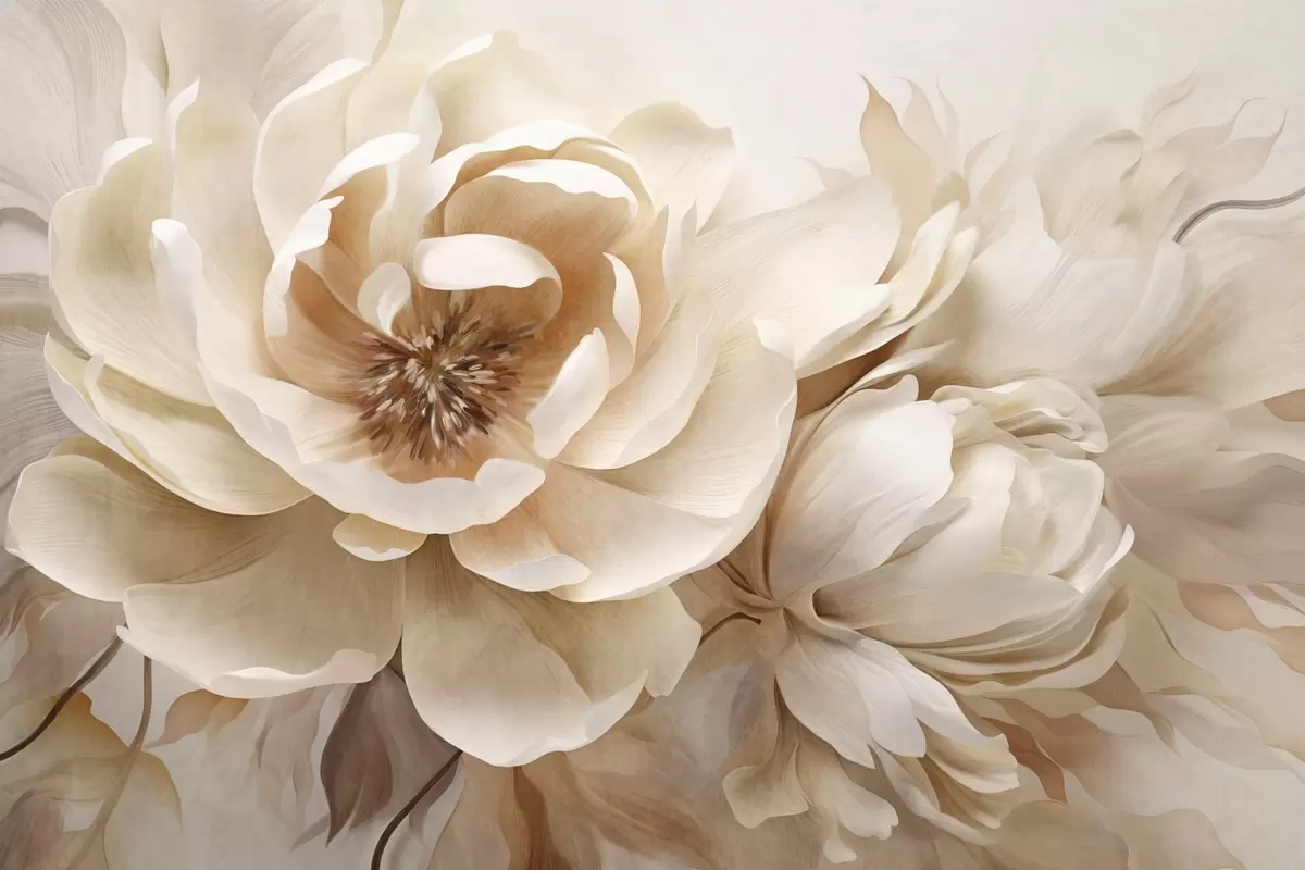 Fototapet Krämiga pioner med bruna centrum och blad på en suddig, ljus abstrakt bakgrund Nr. w09554