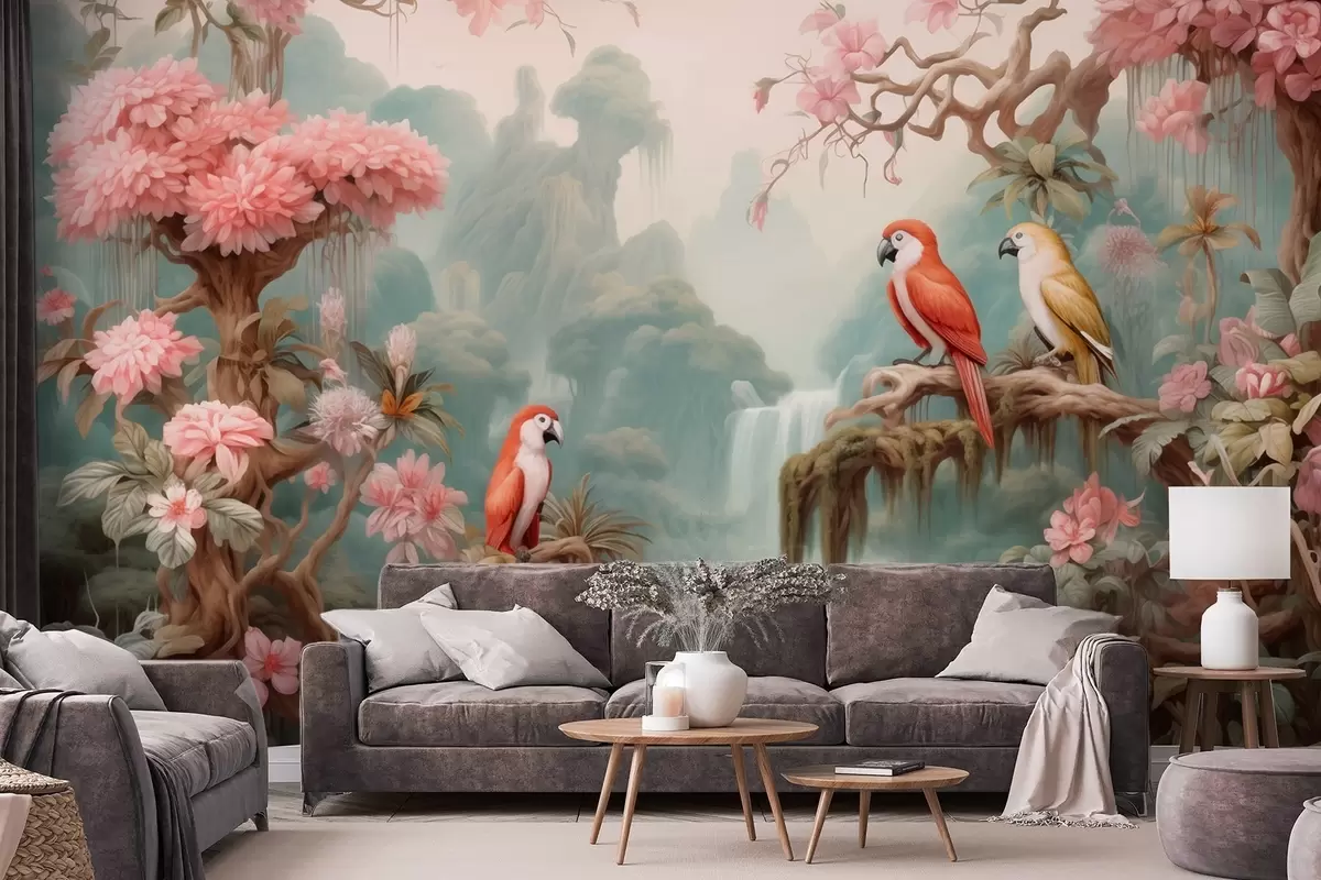 Fototapet En sagolik tropisk skog med papegojor, blommande träd med rosa blommor och ett vattenfall. Nr. w09580