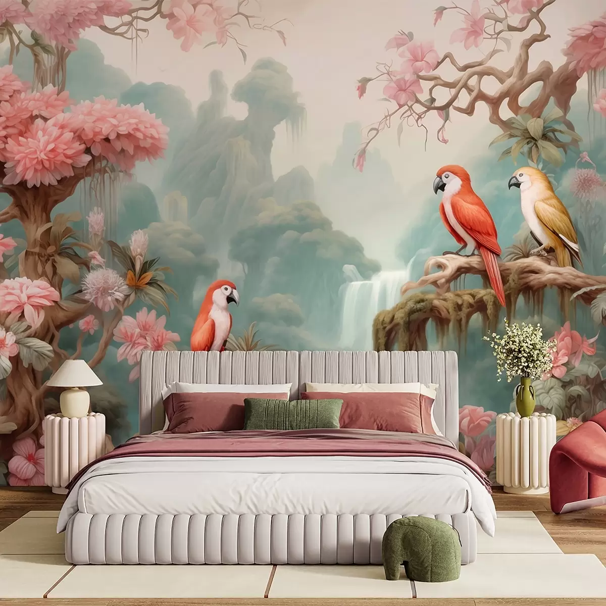 Fototapet En sagolik tropisk skog med papegojor, blommande träd med rosa blommor och ett vattenfall. Nr. w09580