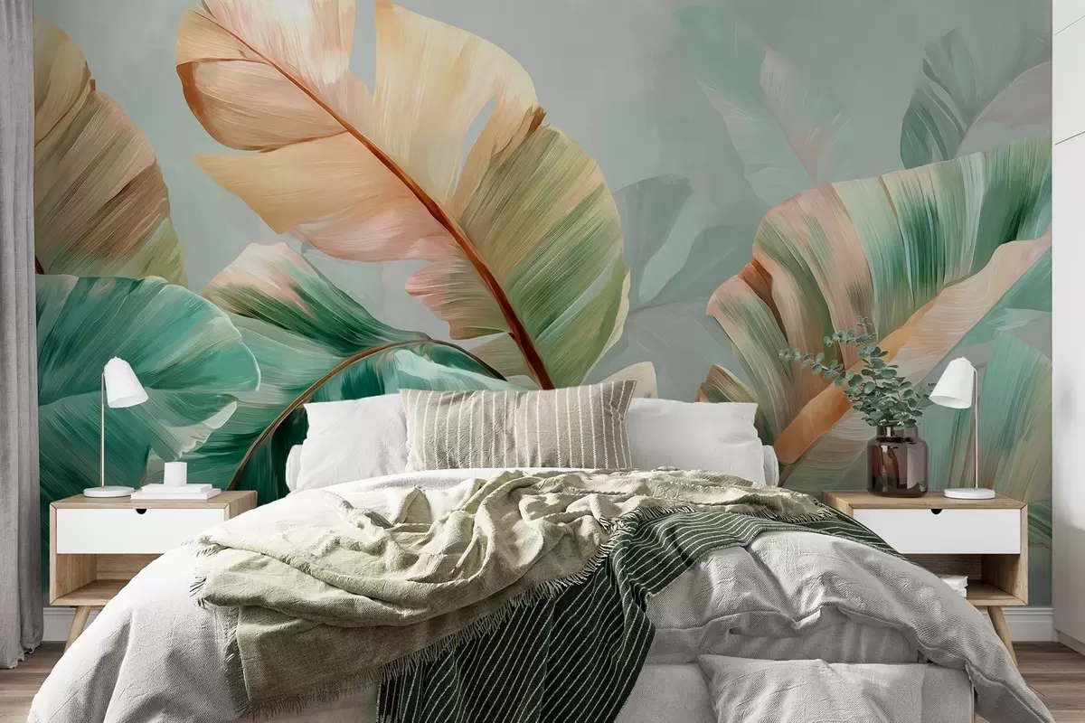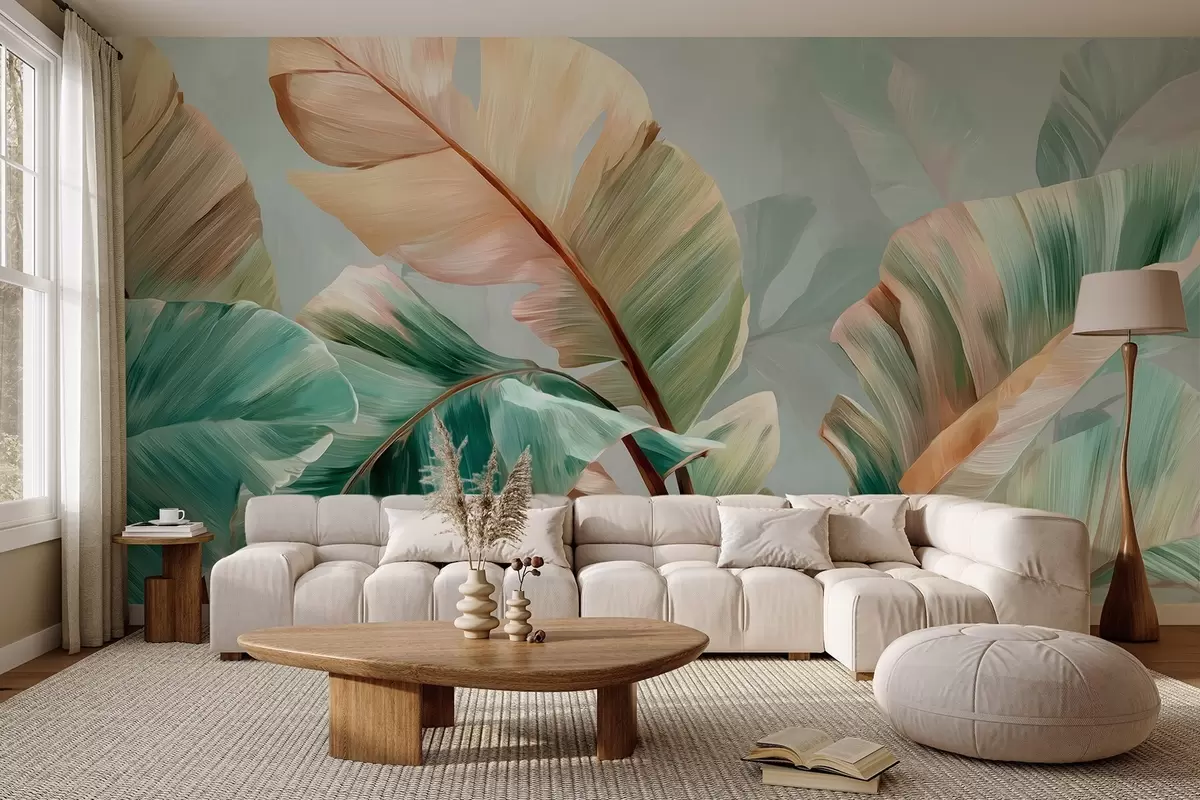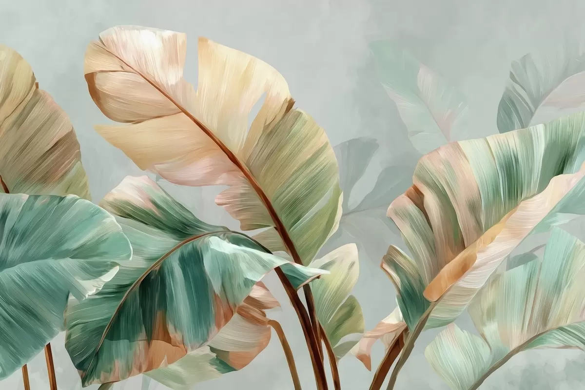 Fototapet Delikata tropiska bananblad i pastellgula och gröna nyanser Nr. w09581