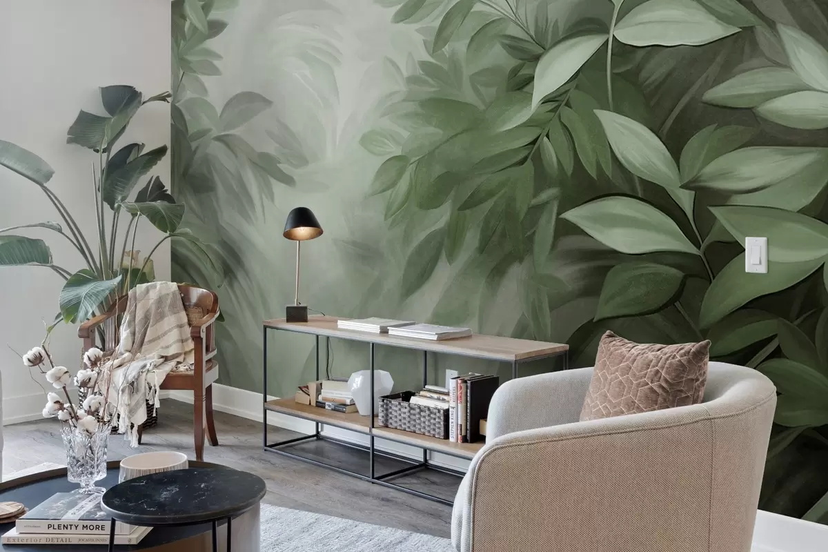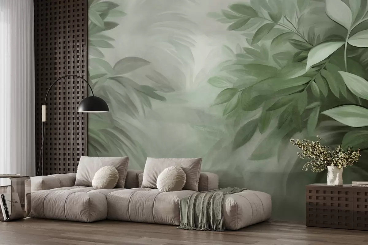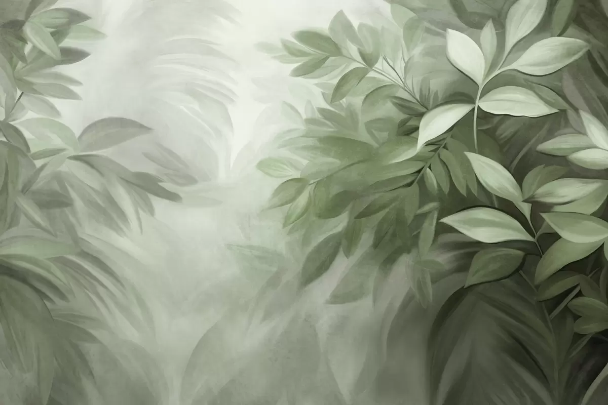 Fototapet Gröna och grå blad med mjuk, suddig textur, i en målerisk stil med synliga penseldrag. Nr. w09584v1