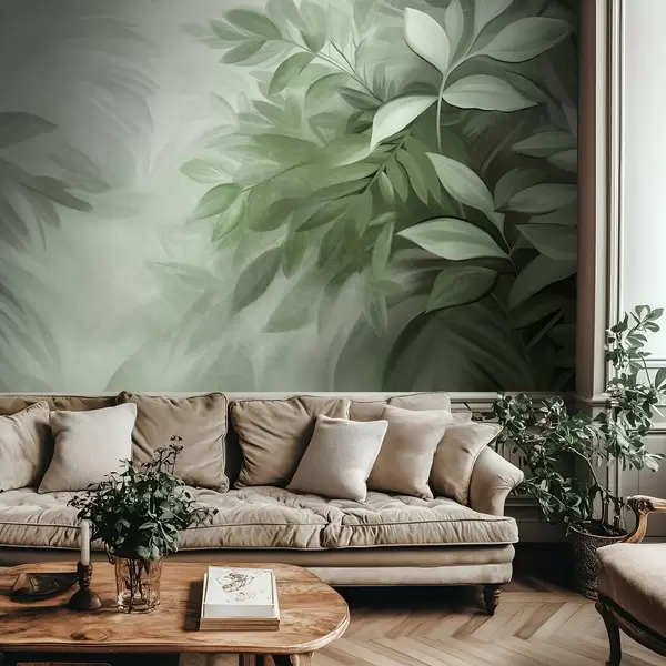 Fototapet Gröna och grå blad med mjuk, suddig textur, i en målerisk stil med synliga penseldrag Nr. w09584v1