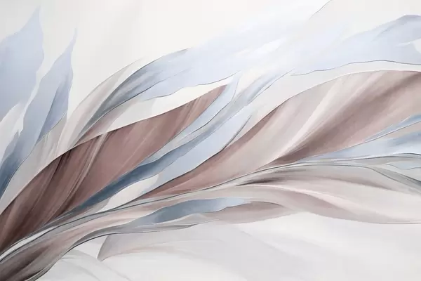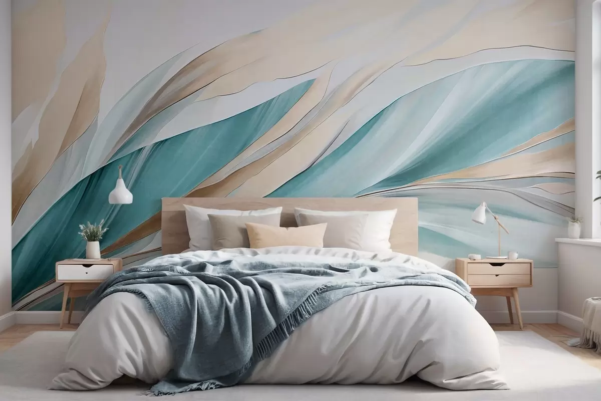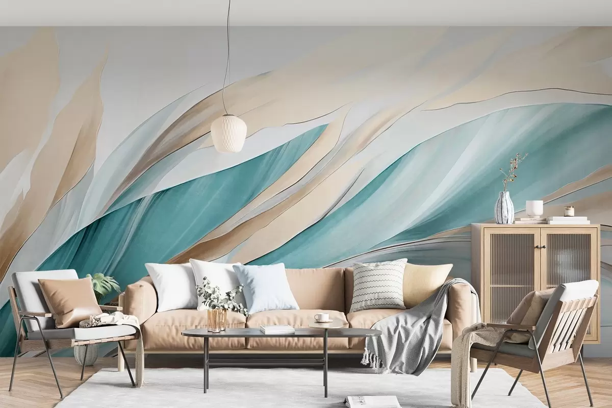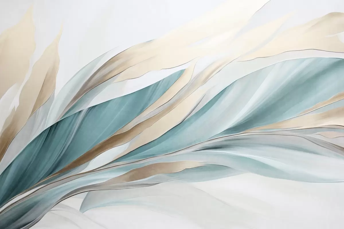 Fototapet Abstrakta flödande vågor i turkos och gult, med tunna former och linjer, mot en vit bakgrund, texturerad konst Nr. w09585