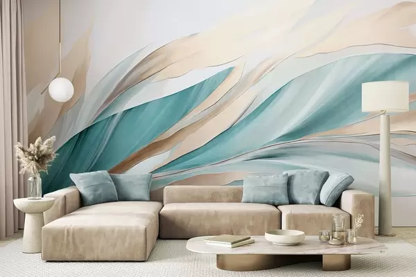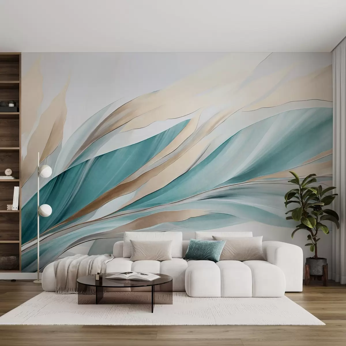 Fototapet Abstrakta flödande vågor i turkos och gult, med tunna former och linjer, mot en vit bakgrund, texturerad konst Nr. w09585