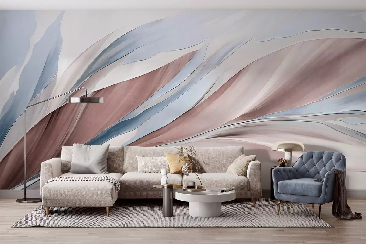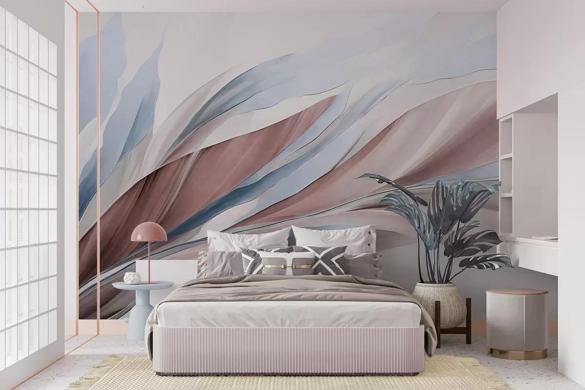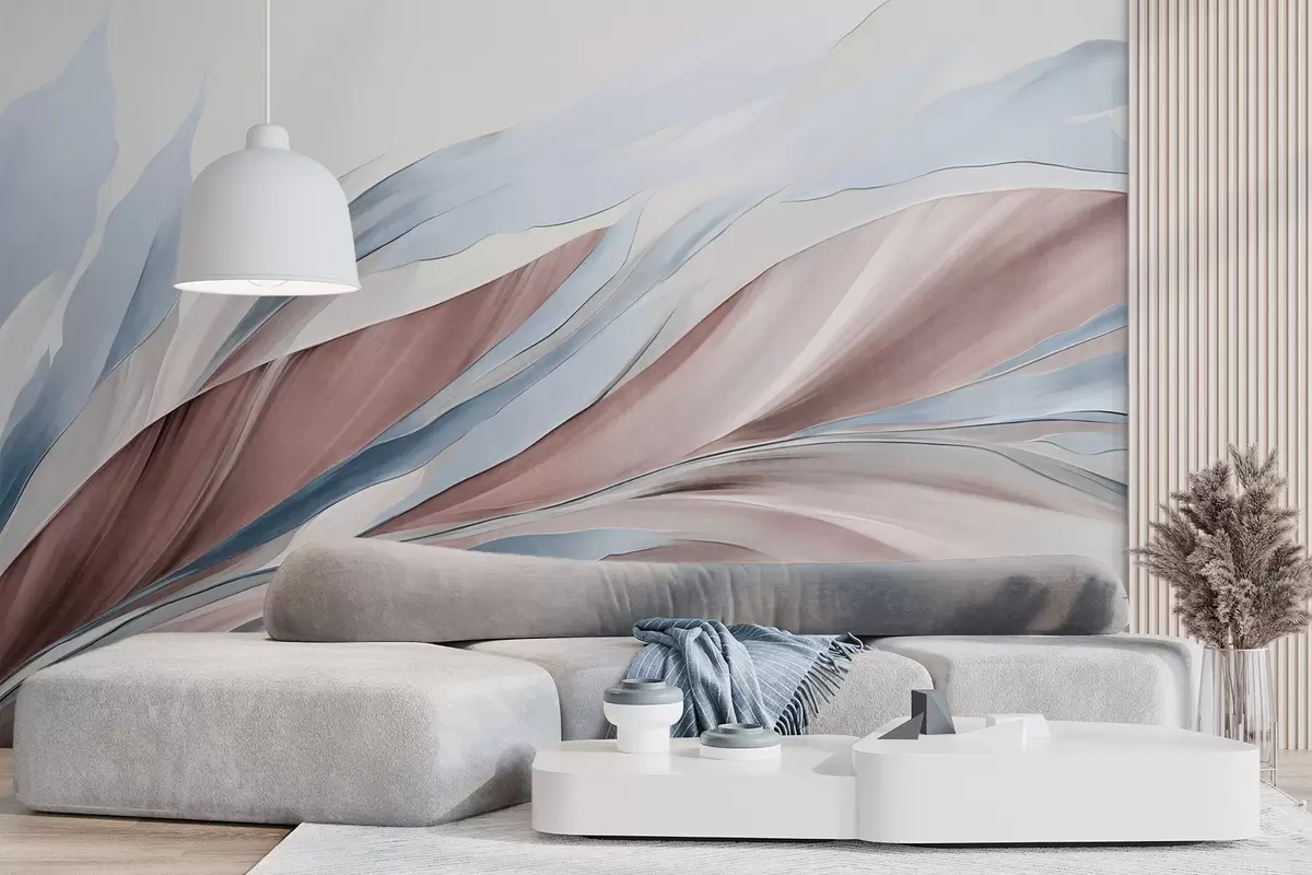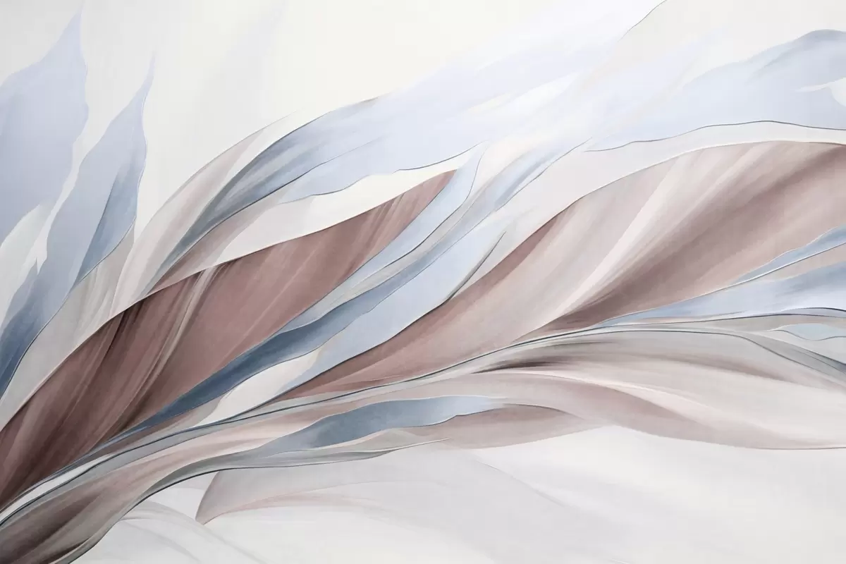 Fototapet Abstrakta flödande vågor i blått och brunt, med tunna former och linjer, mot en vit bakgrund, texturerad konst Nr. w09585v1