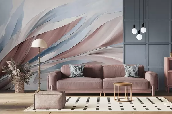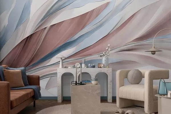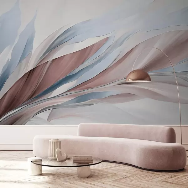 Fototapet Abstrakta flödande vågor i blått och brunt, med tunna former och linjer, mot en vit bakgrund, texturerad konst Nr. w09585v1