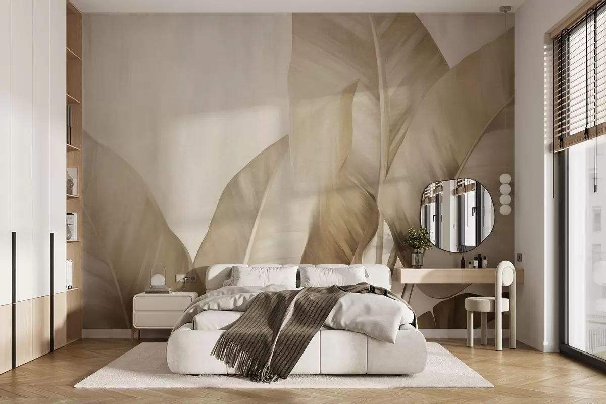 Fototapet Stora, ljusbruna bananblad med struktur mot en ljusbeige bakgrund, med en mjuk och minimalistisk estetik. Nr. w09586