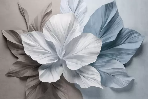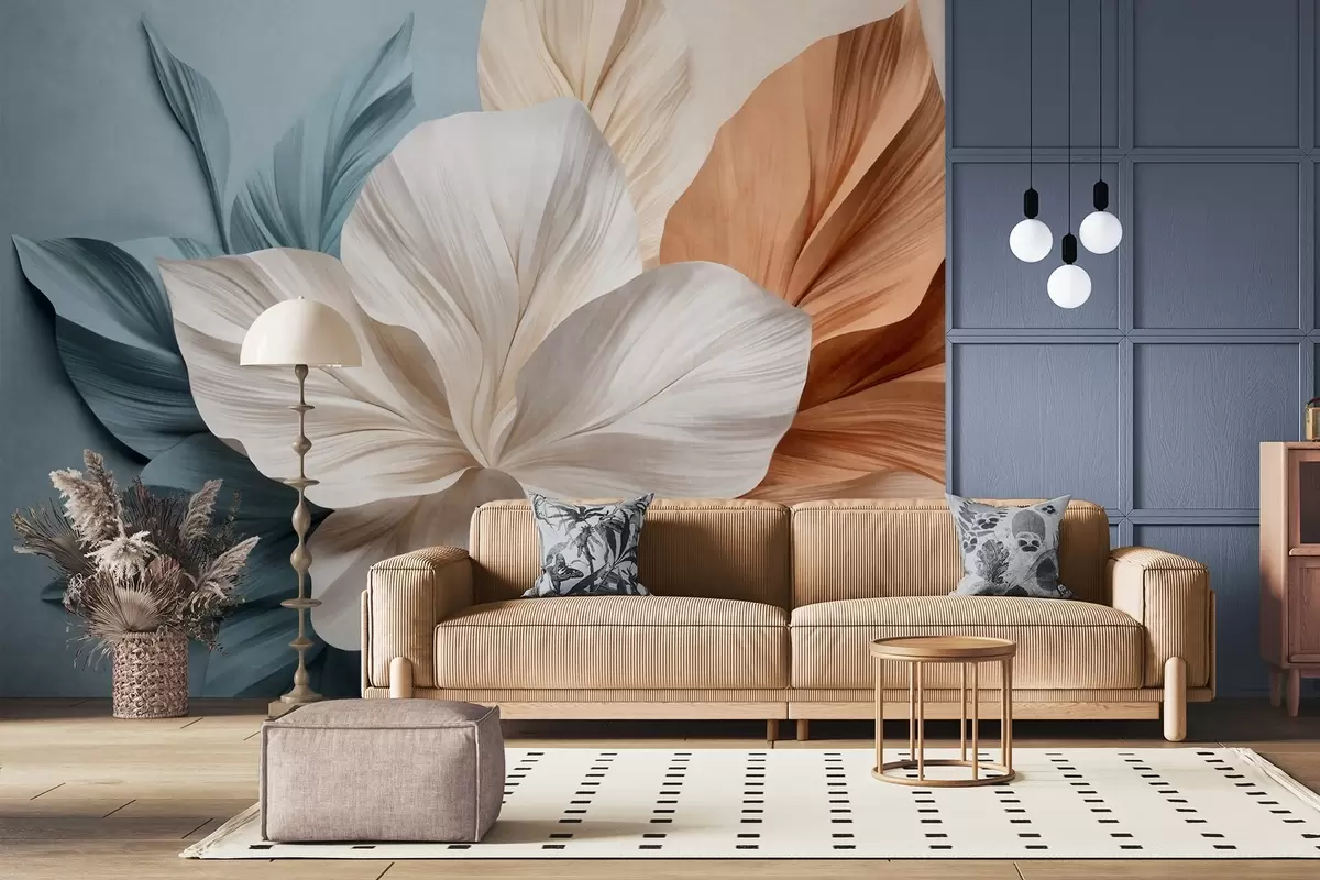 Fototapet Abstrakt blomma med flera kronblad och texturerade blad i nyanser av persika och blått, mjuk bakgrund Nr. w09604
