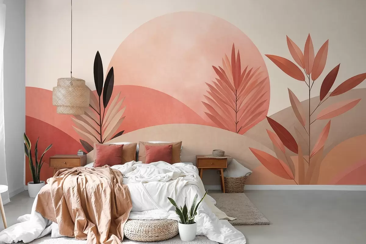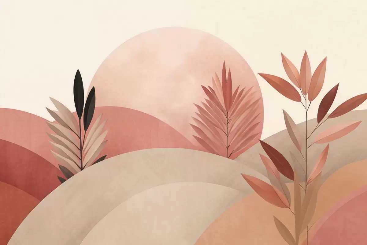 Fototapet Abstrakt boho-landskap, sol bakom böljande kullar, växter i förgrunden, minimalistiskt, strukturerat, dämpade färger Nr. w09608