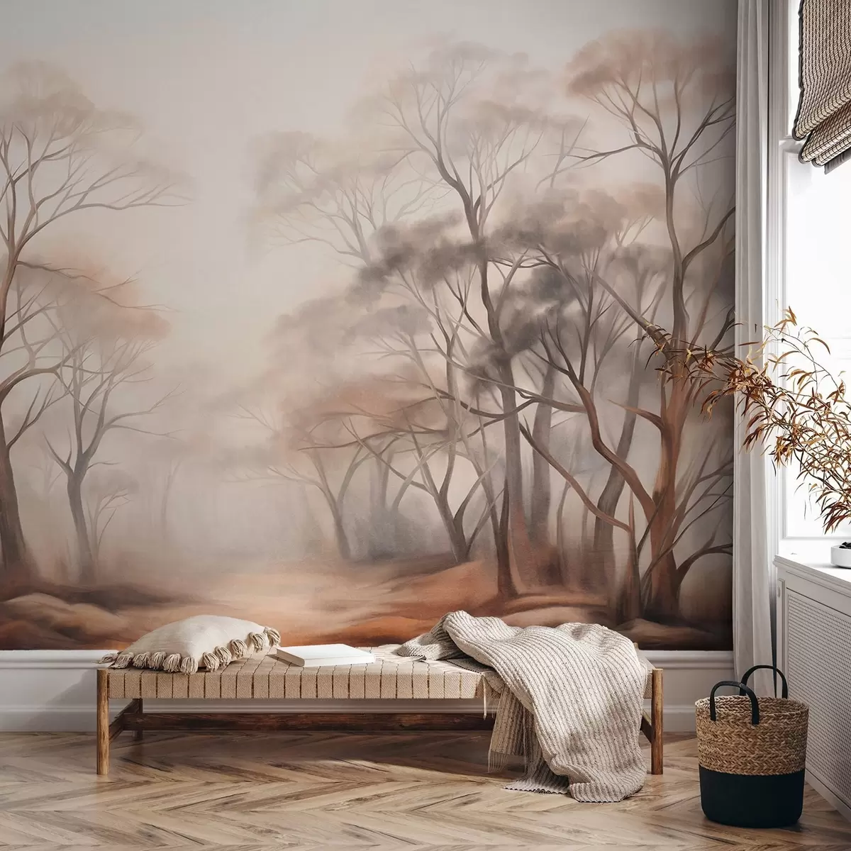 Fototapet Texturerade träd i en dimmig skog, dimhöljt landskap med dämpade färger och mjuk belysning Nr. w09609