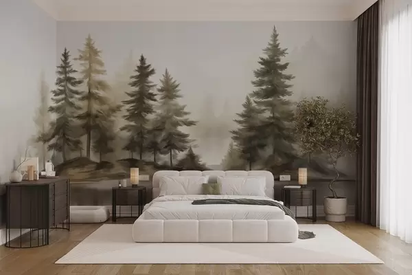 Fototapet En strukturerad dimskog med höga tallar som målar imitation Nr. w09610