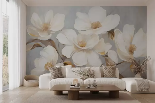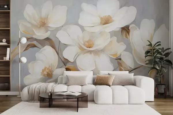 Fototapet En texturerad målning som imiterar flera vita magnoliablommor mot en dämpad pastellbakgrund. Nr. w09612