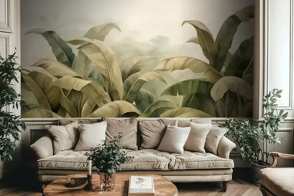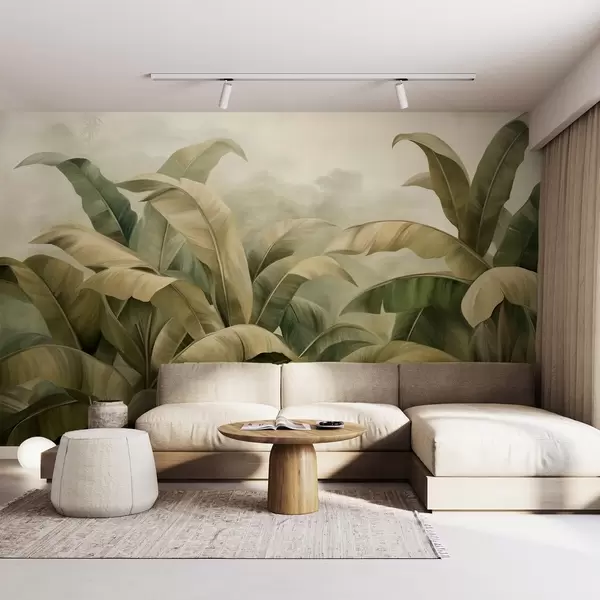 Fototapet Strukturerat, tätt djungellandskap med stora bananblad i dämpade gröna och beige toner. Nr. w09613