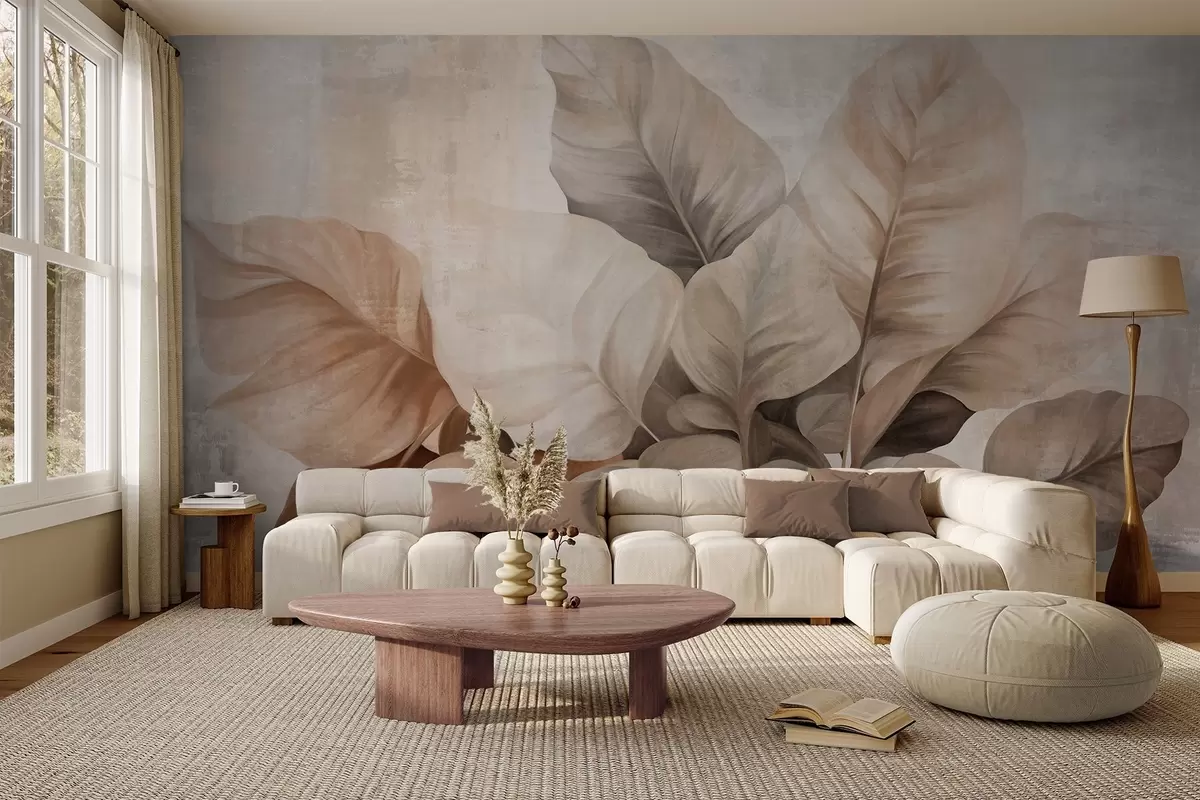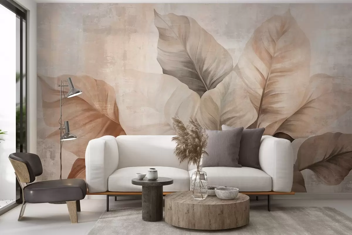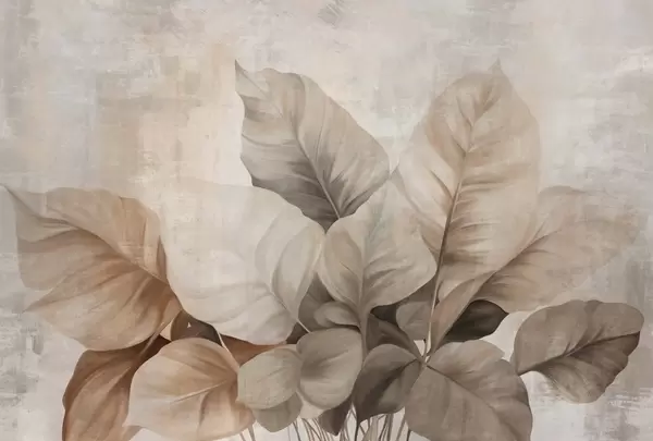 Fototapet Texturerad målning som imiterar stora, ljusbruna blad mot en neutral bakgrund med subtila penseldrag. Nr. w09614