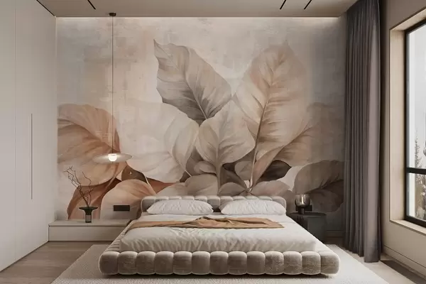 Fototapet Texturerad målning som imiterar stora, ljusbruna blad mot en neutral bakgrund med subtila penseldrag. Nr. w09614
