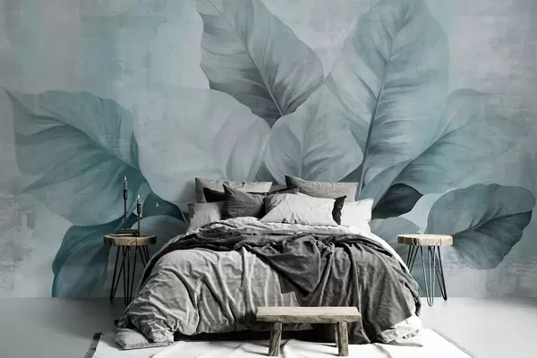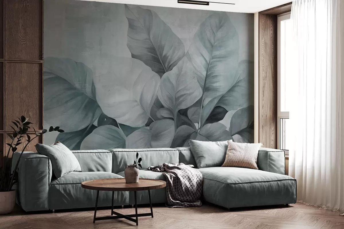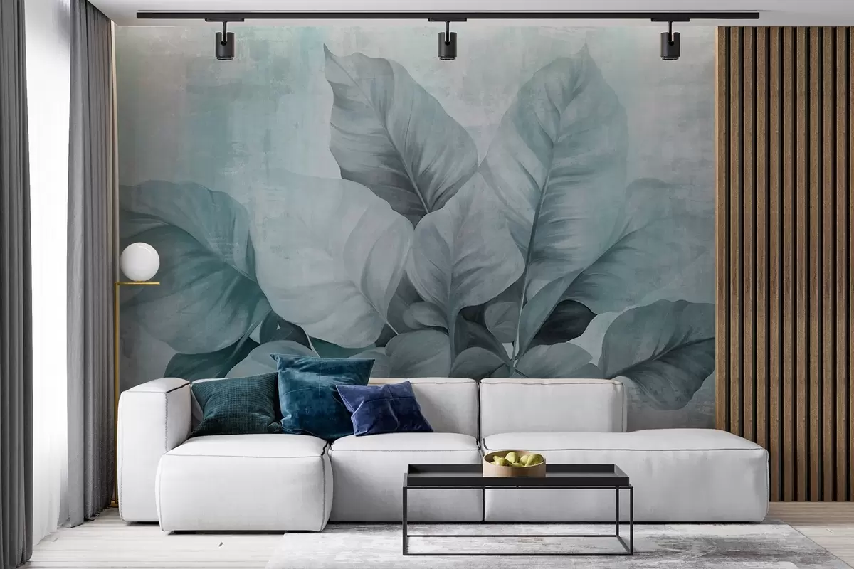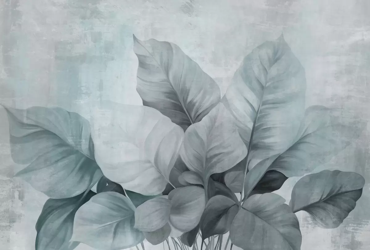 Fototapet Texturerad målning som imiterar stora, ljusblå blad mot en neutral bakgrund med subtila penseldrag. Nr. w09614v2