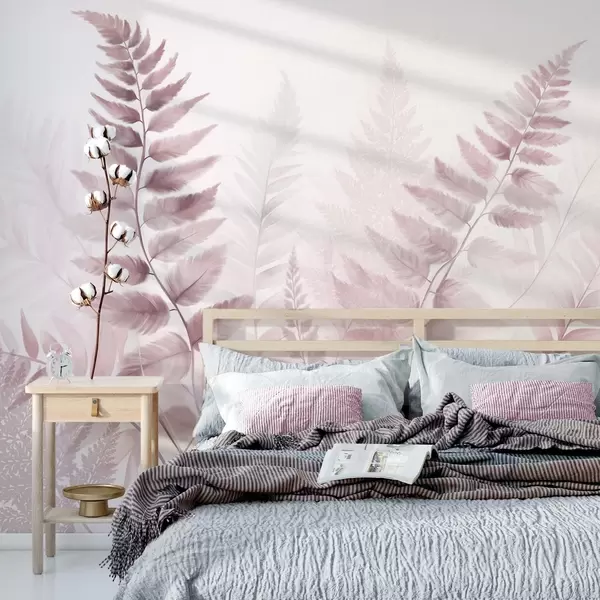Fototapet Texturerade torkade ormbunksblad i olika nyanser av rosa, med en mjuk, ljus bakgrund i akvarellstil. Nr. w09615v2