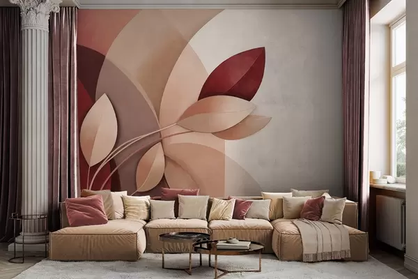 Fototapet Abstrakt texturerad gren med löv i nyanser av brunt, beige och rött, mot en bakgrund av abstrakta former. Nr. w09618