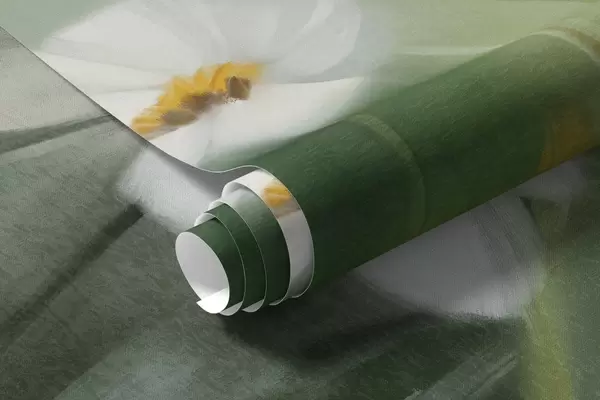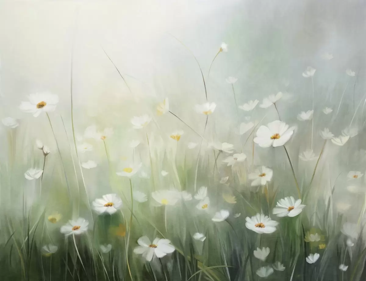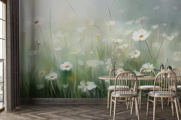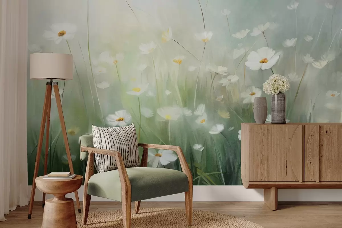 Fototapet Abstrakt motiv med vita prästkragar, grönt gräs och en mjuk, dimmig bakgrund i målningsstil. Nr. w09619