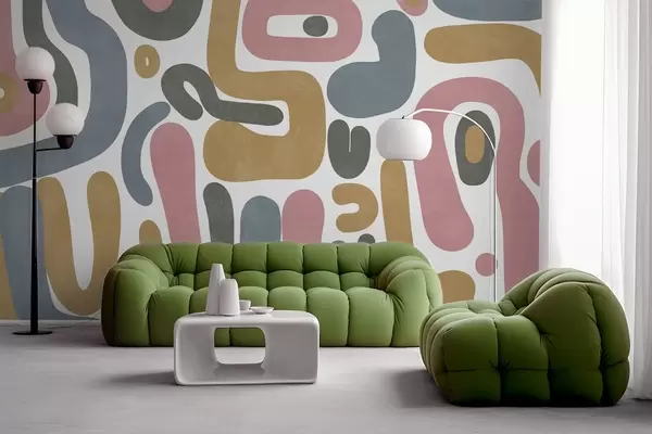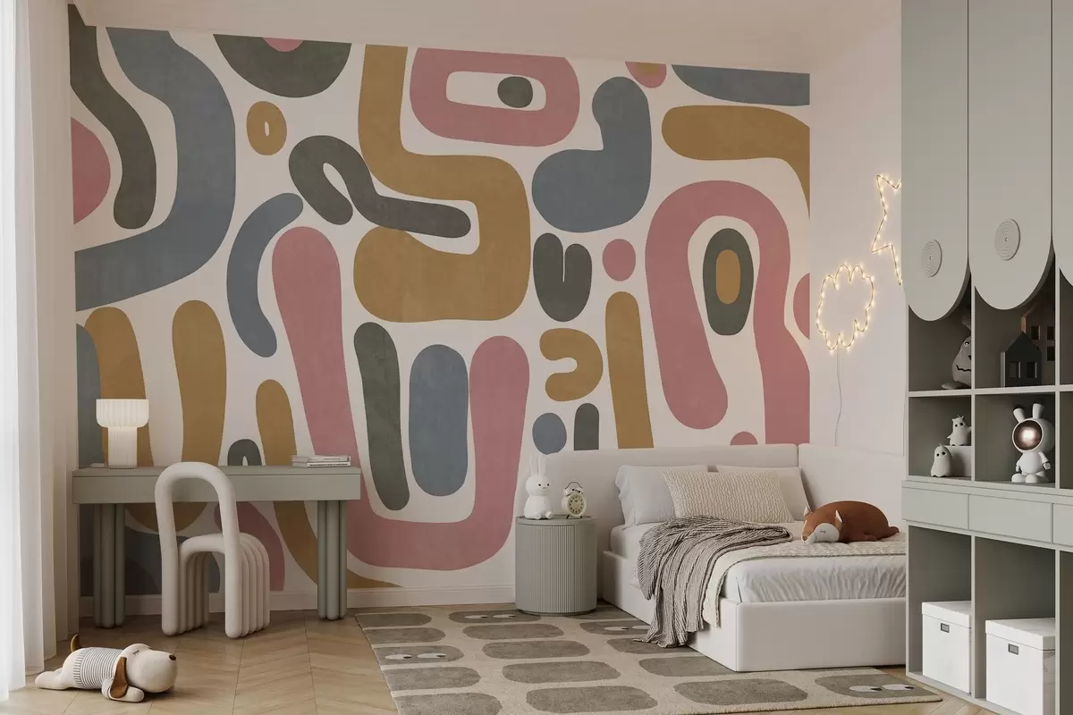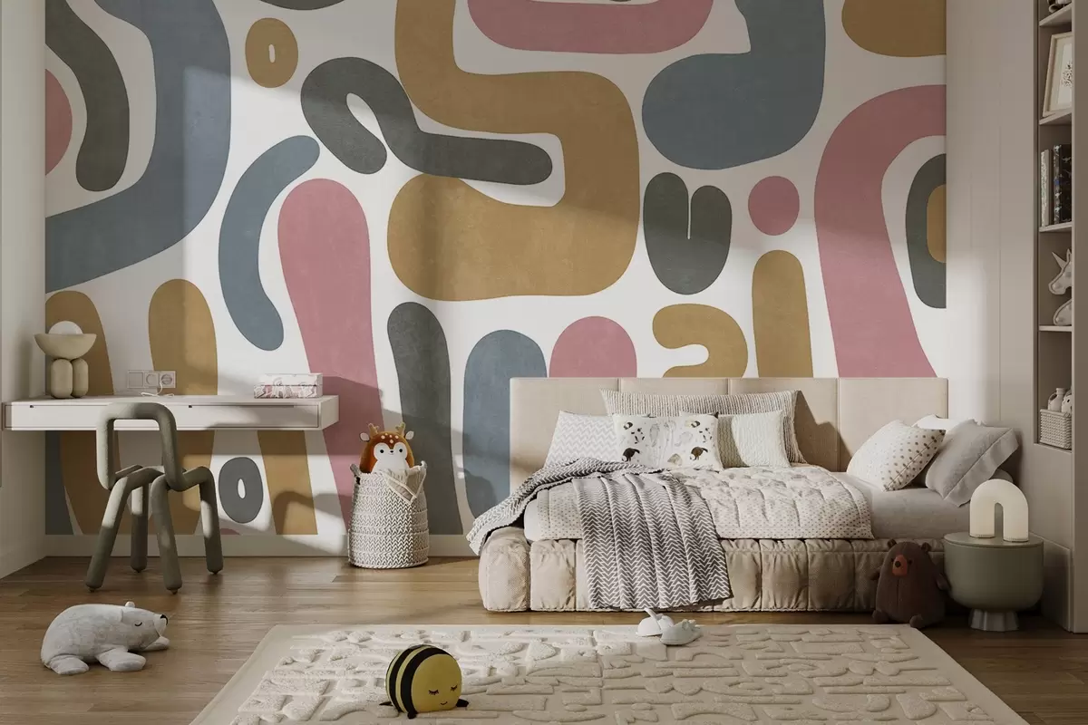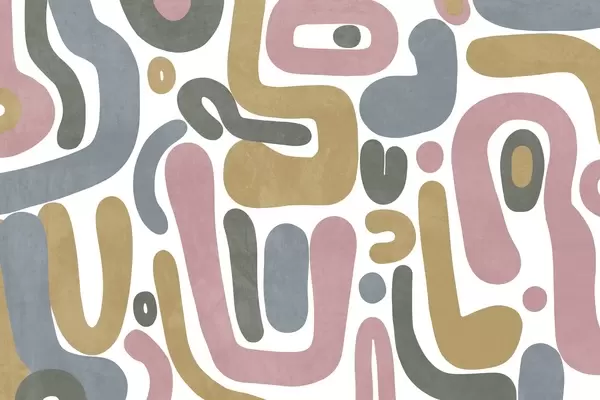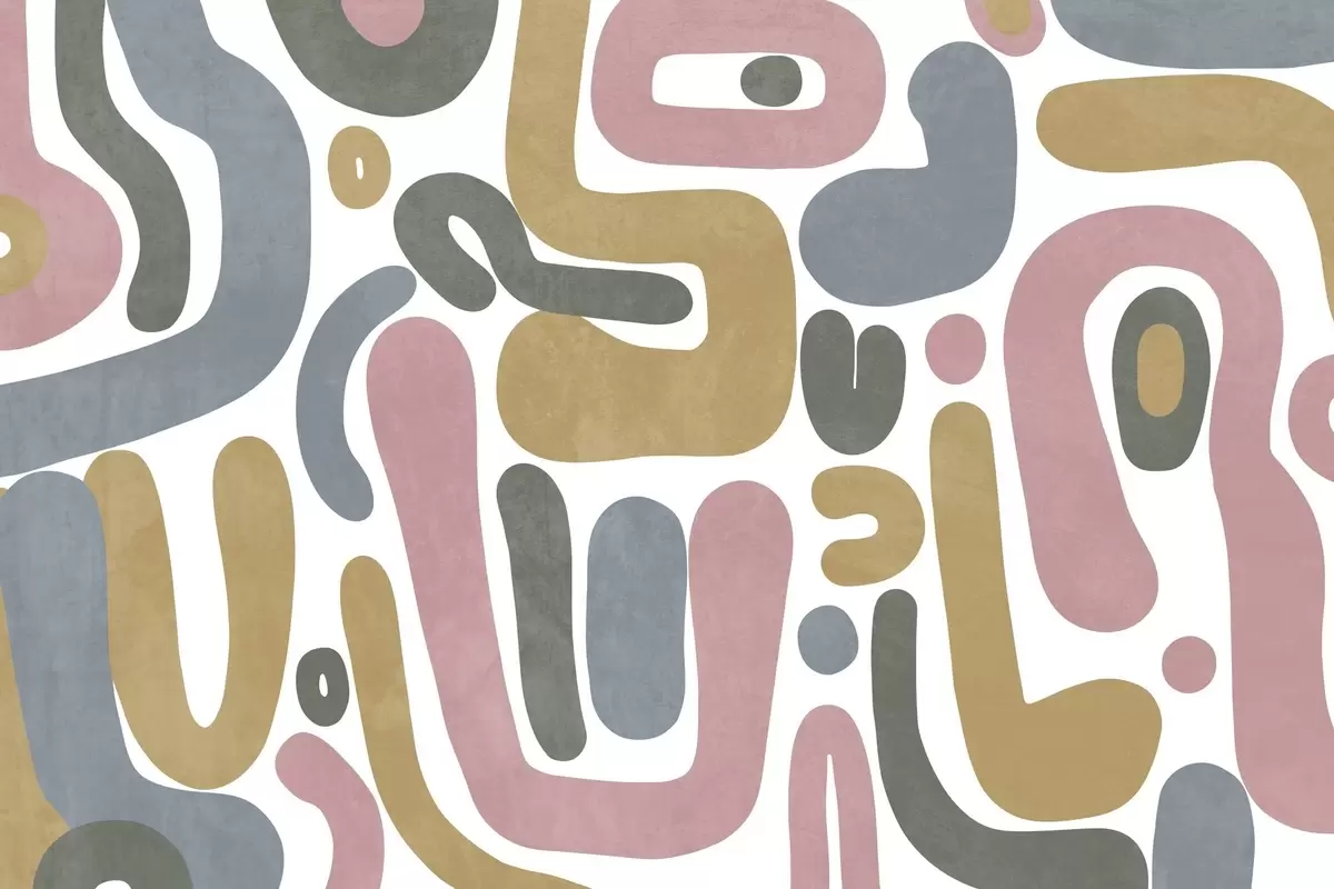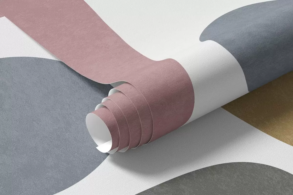 Fototapet Abstrakta texturerade former i pastellrosa, dämpad blå, senapsgul och grå på vit bakgrund modern konst Nr. w09620