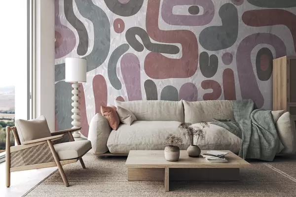 Fototapet Abstrakta texturerade former i dämpade rosa, gröna och grå toner på en texturerad bakgrund modern konst Nr. w09622