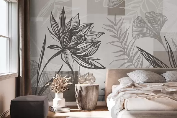 Fototapet Texturerade stiliserade blommor och blad i nyanser av brunt och beige, med geometrisk bakgrund, linjekonst Nr. w09629