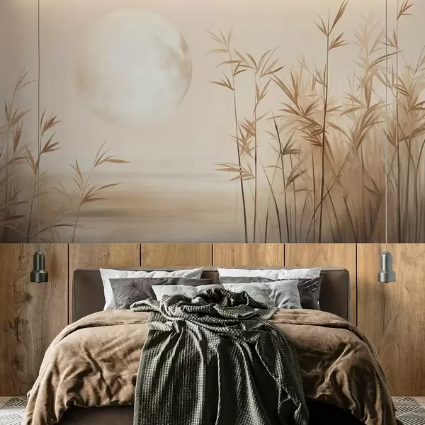 Fototapet Strukturerat landskap med höga vassruggar, sjö och blek måne i en disig himmel Nr. w09631