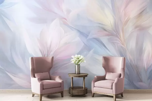 Fototapet Mjuka, pastellfärgade blad och fjädrar i nyanser av rosa, blått och gult, abstrakt och strukturerat tryck Nr. w09634