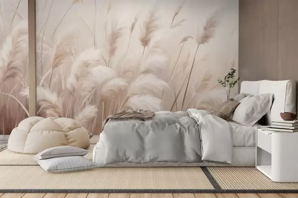 Fototapet Högt, strukturerat pampasgräs i mjuka, varma, neutrala toner, med en suddig, ljus bakgrund. Nr. w09637