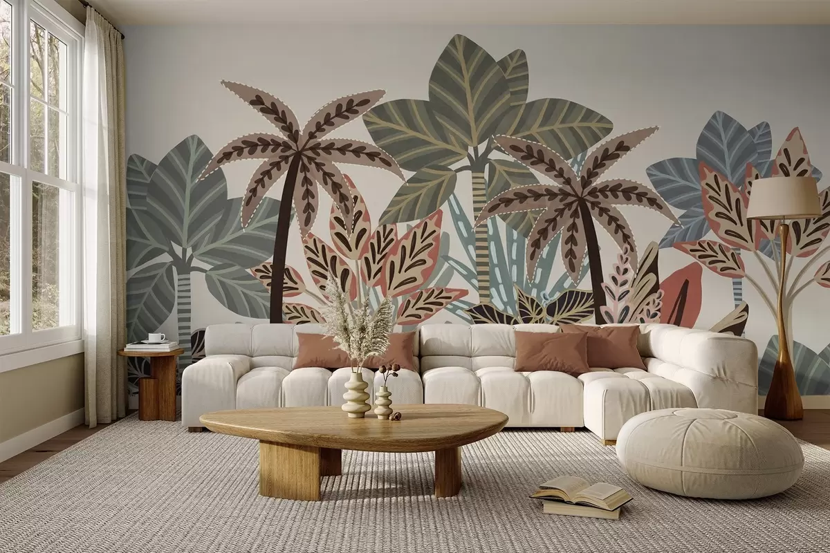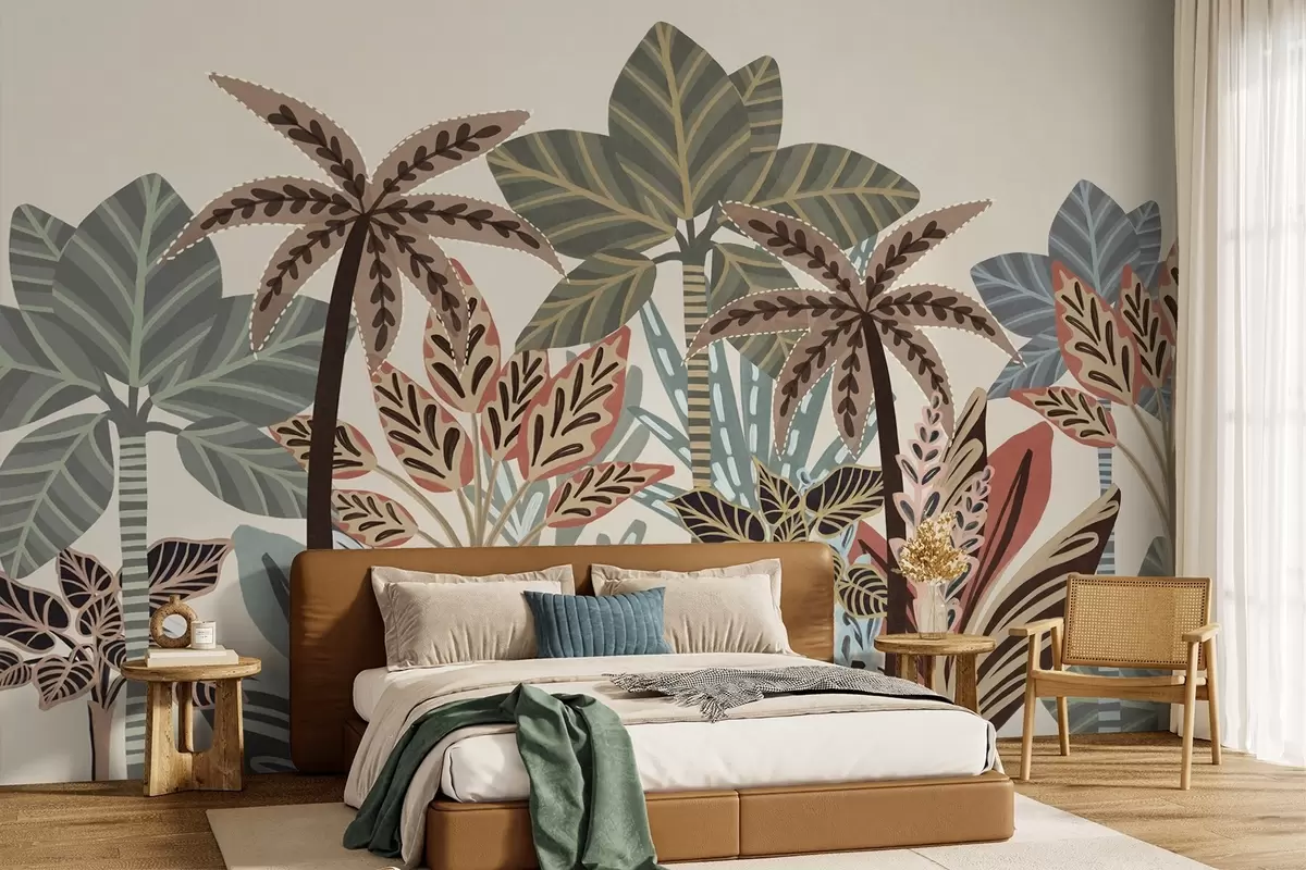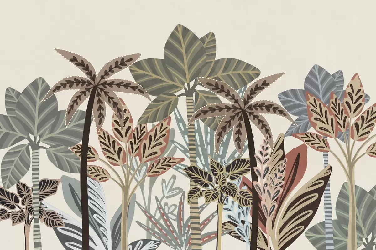 Fototapet Texturerade tropiska växter och palmer i dämpade färger i dekorativ boho-stil mot en krämfärgad bakgrund Nr. w09639