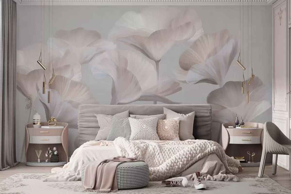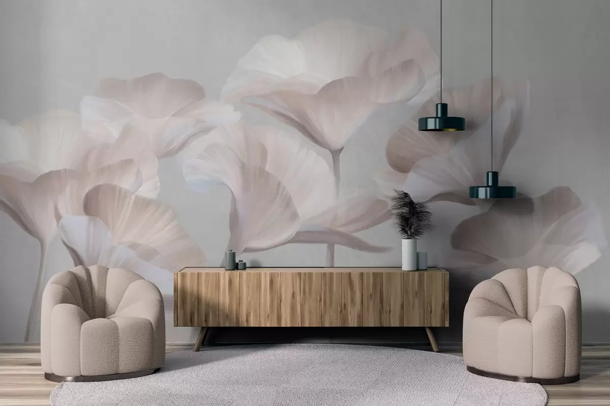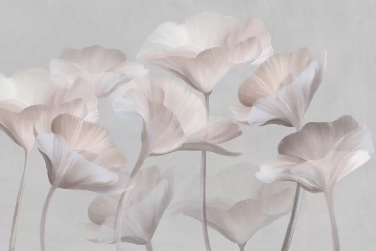Fototapet Ljuspersikofärgade, genomskinliga lotusblommor med delikata kronblad mot en dämpad grå bakgrund. Nr. w09640