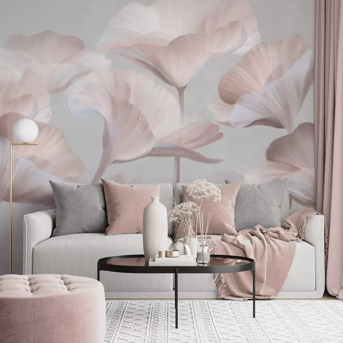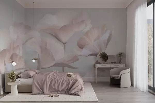 Fototapet Ljuspersikofärgade, genomskinliga lotusblommor med delikata kronblad mot en dämpad grå bakgrund. Nr. w09640