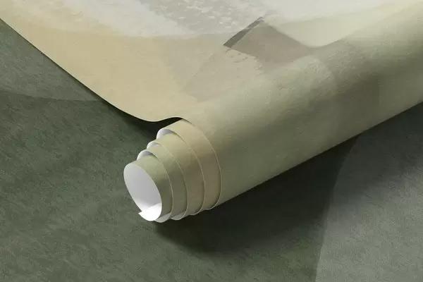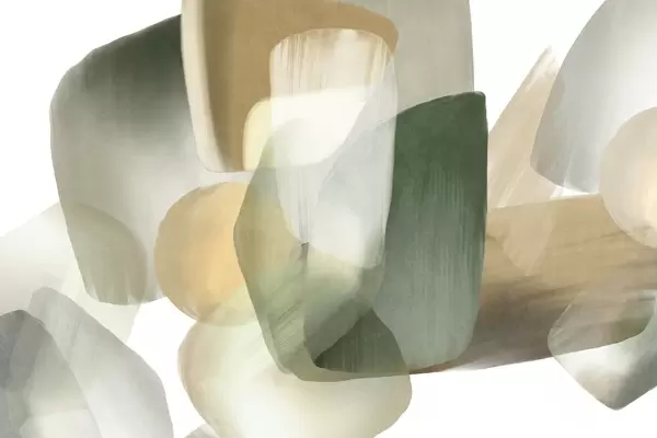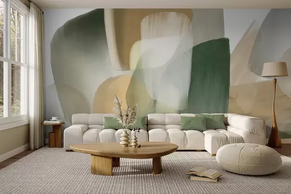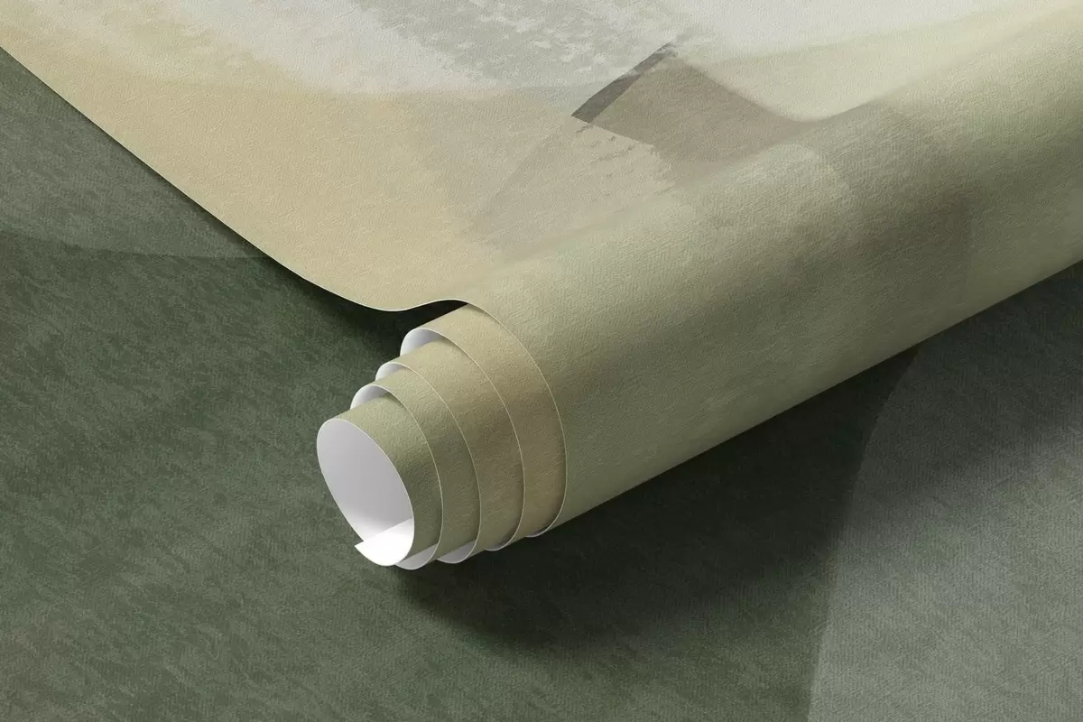 Fototapet Abstrakta texturerade former i dämpade gröna och beige färger, med mjuka kanter och överlappande lager. Nr. w09642
