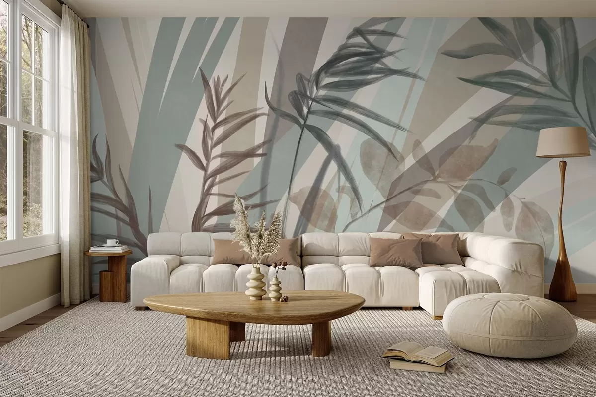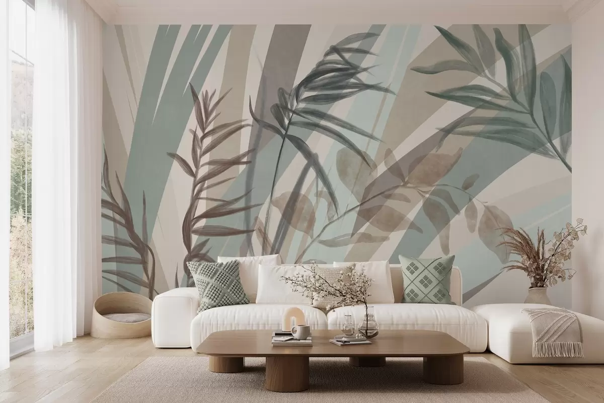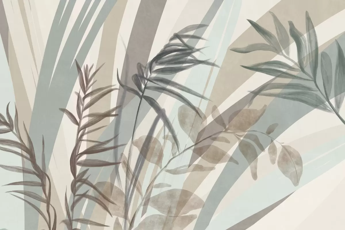 Fototapet Högt texturerat gräs och löv i dämpade jordtoner, med abstrakta linjer i bakgrunden, som skapar ett organiskt tryck. Nr. w09643