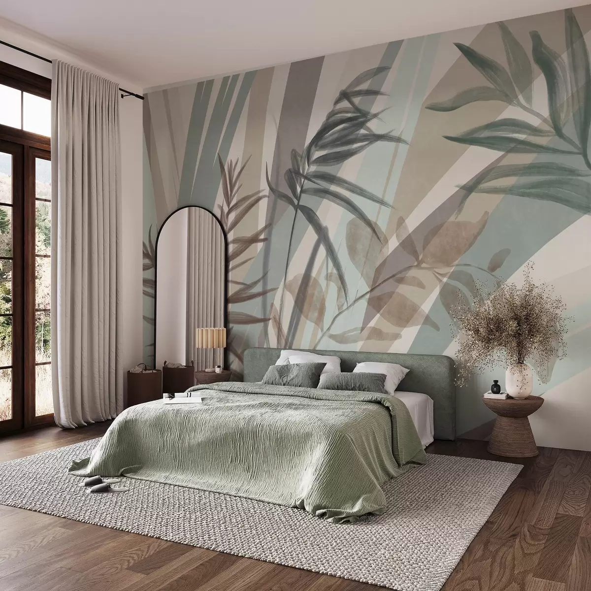 Fototapet Högt texturerat gräs och löv i dämpade jordtoner, med abstrakta linjer i bakgrunden, som skapar ett organiskt tryck. Nr. w09643