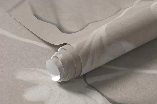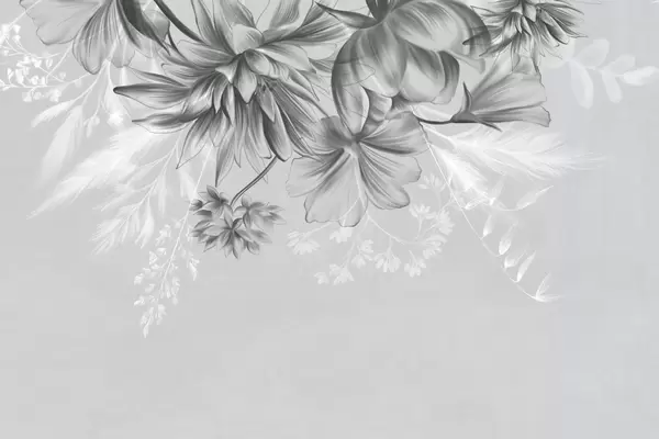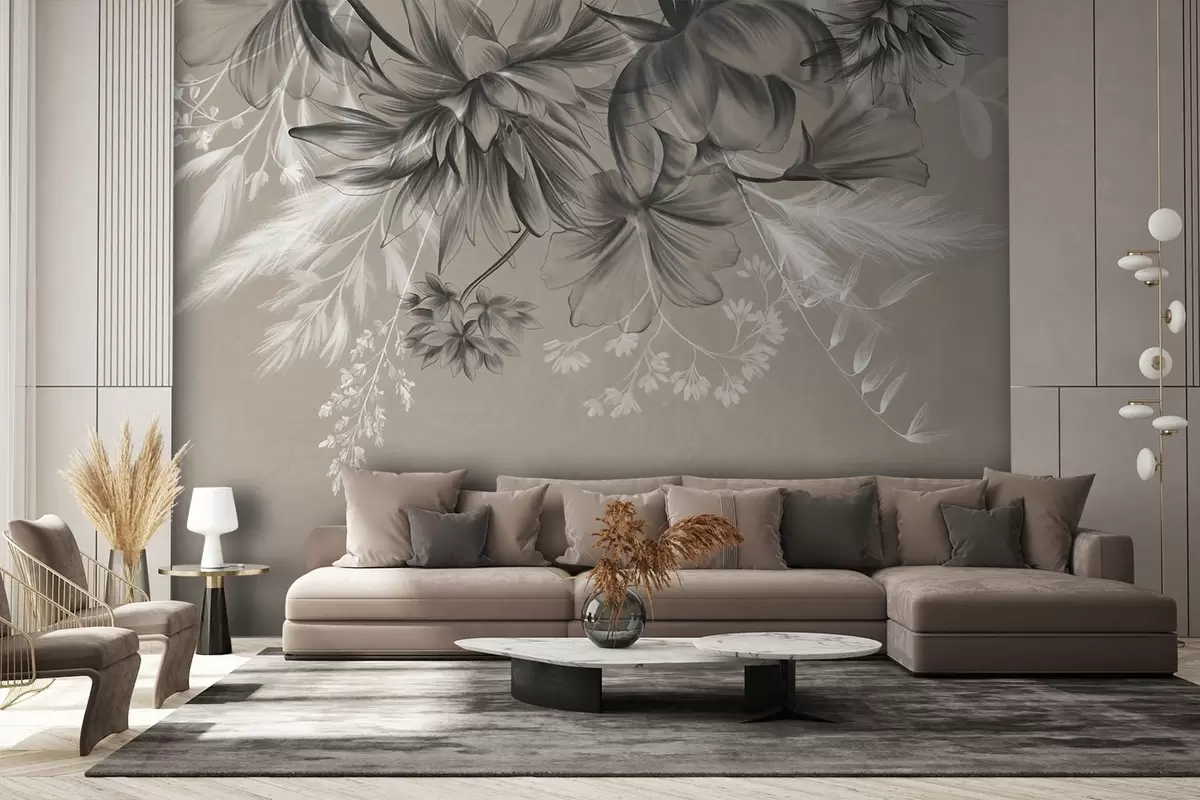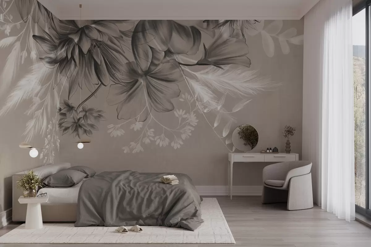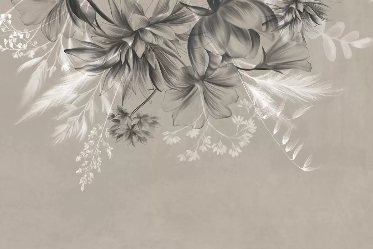 Fototapet Texturerade blommor och ormbunkar i mörkgrå och vita nyanser mot en dämpad beige bakgrund, teckningsstil Nr. w09644