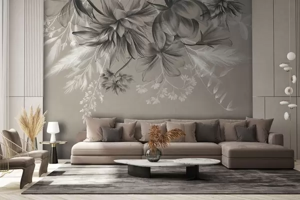 Fototapet Texturerade blommor och ormbunkar i mörkgrå och vita nyanser mot en dämpad beige bakgrund, teckningsstil Nr. w09644