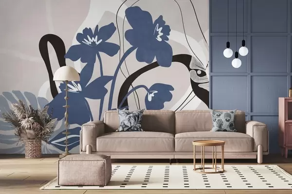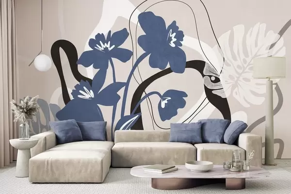 Fototapet Abstrakt texturerade blå blommor med vita och svarta former mot en ljusbeige bakgrund, minimalistisk konst Nr. w09645