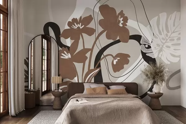 Fototapet Abstrakt texturerade bruna blommor med vita och svarta former mot en beige bakgrund, minimalistisk konst Nr. w09645v1