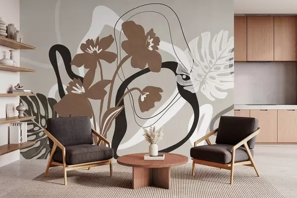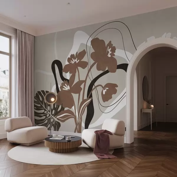 Fototapet Abstrakt texturerade bruna blommor med vita och svarta former mot en beige bakgrund, minimalistisk konst Nr. w09645v1
