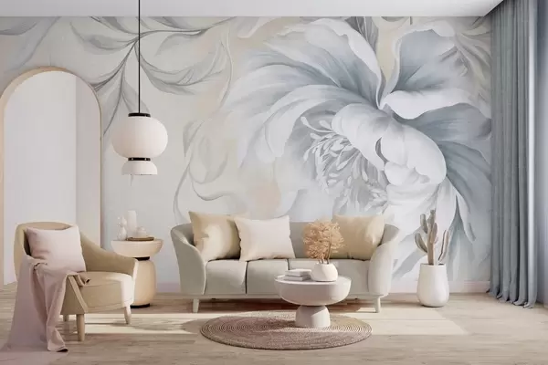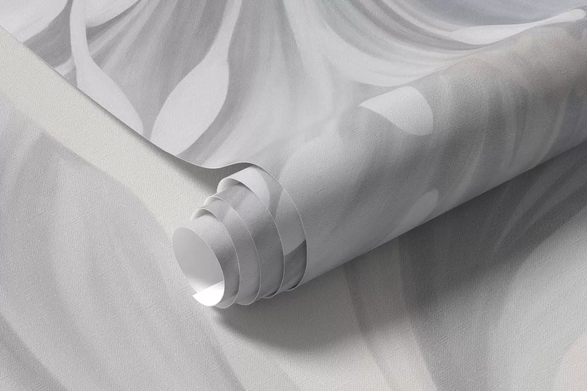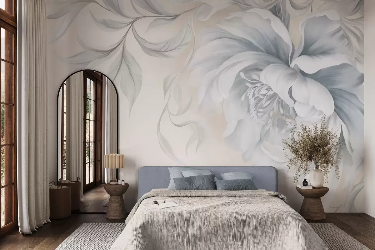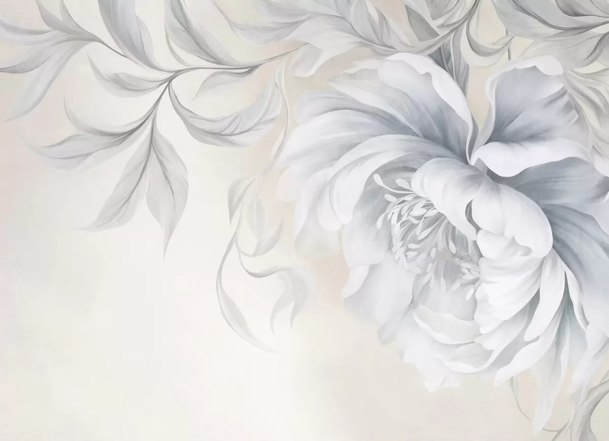 Fototapet Stor, strukturerad pion med fina kronblad och grå blad, målad i en mjuk stil Nr. w09647