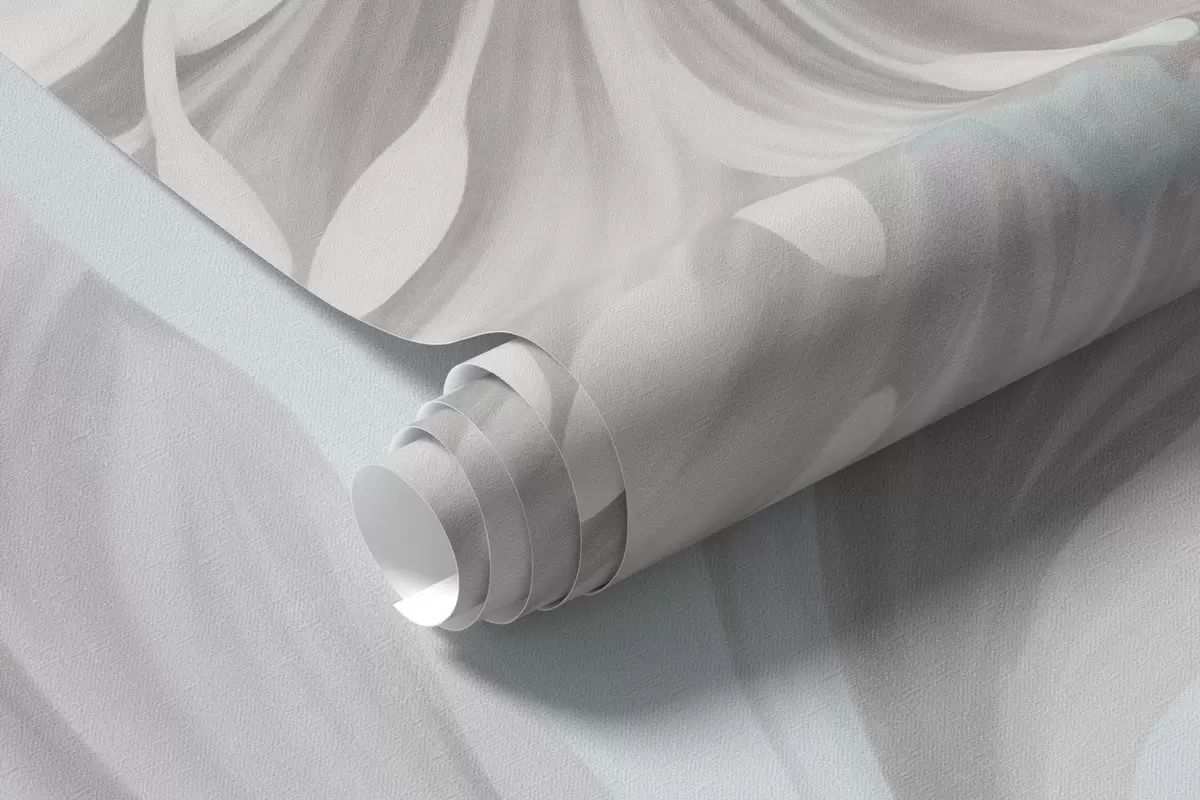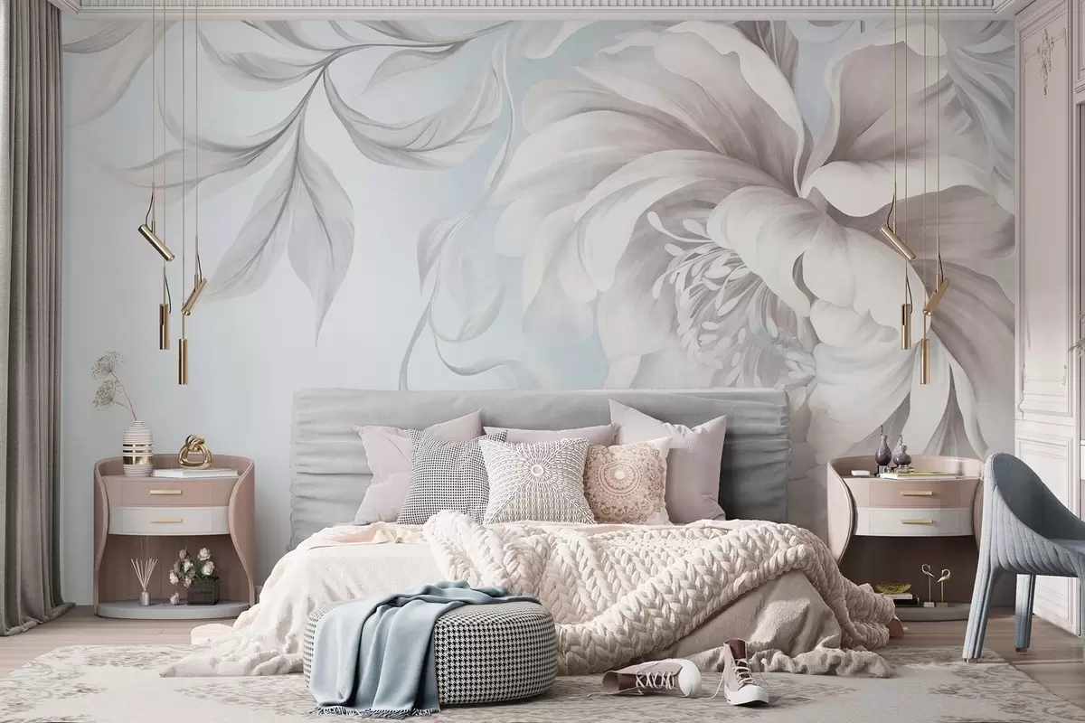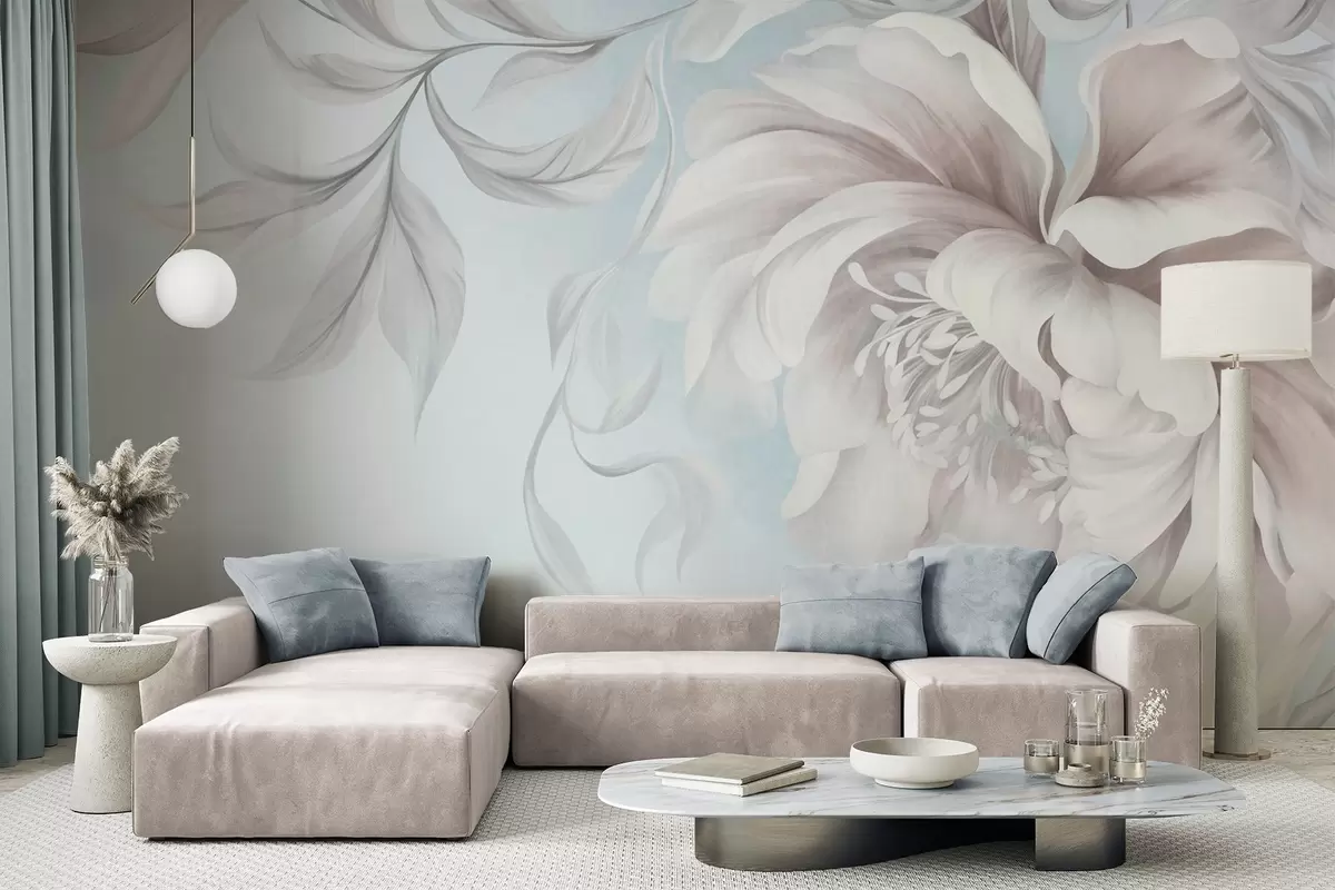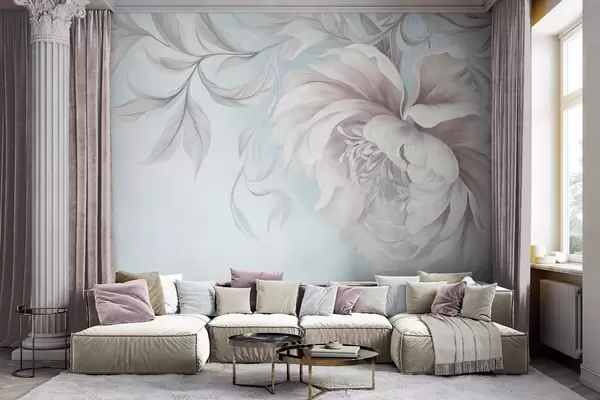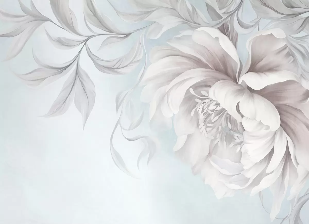 Fototapet Stor, strukturerad pion med fina kronblad och grå blad, målad i en mjuk stil Nr. w09647v1