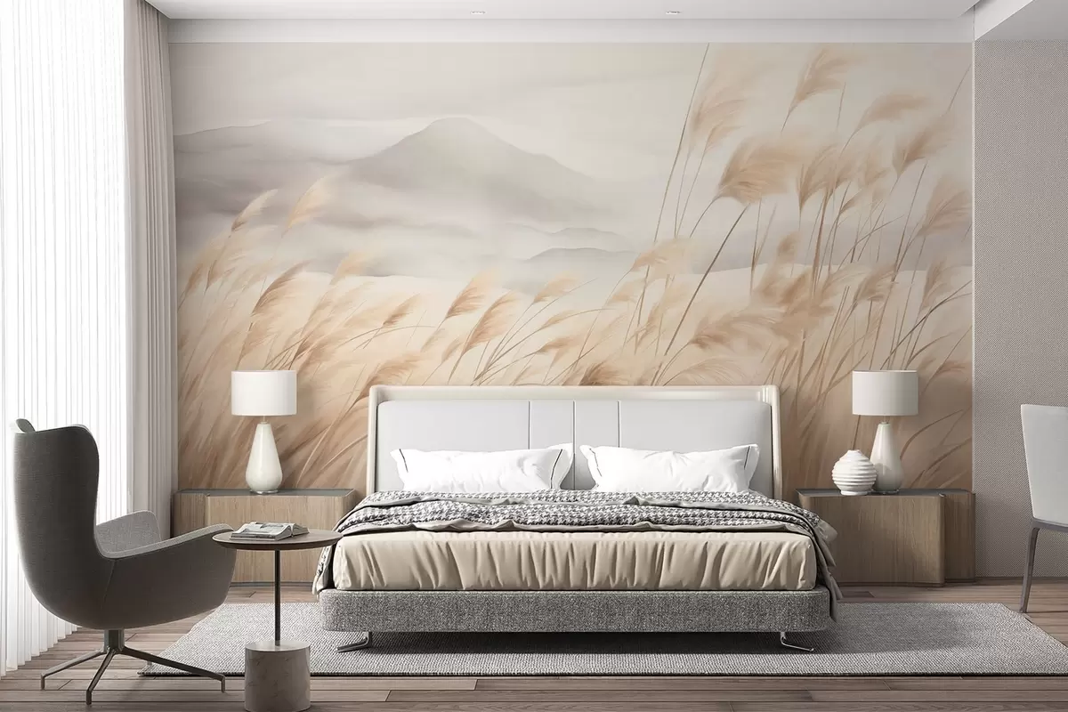 Fototapet Strukturerat bergslandskap med högt, torrt gräs under en disig himmel Nr. w09649