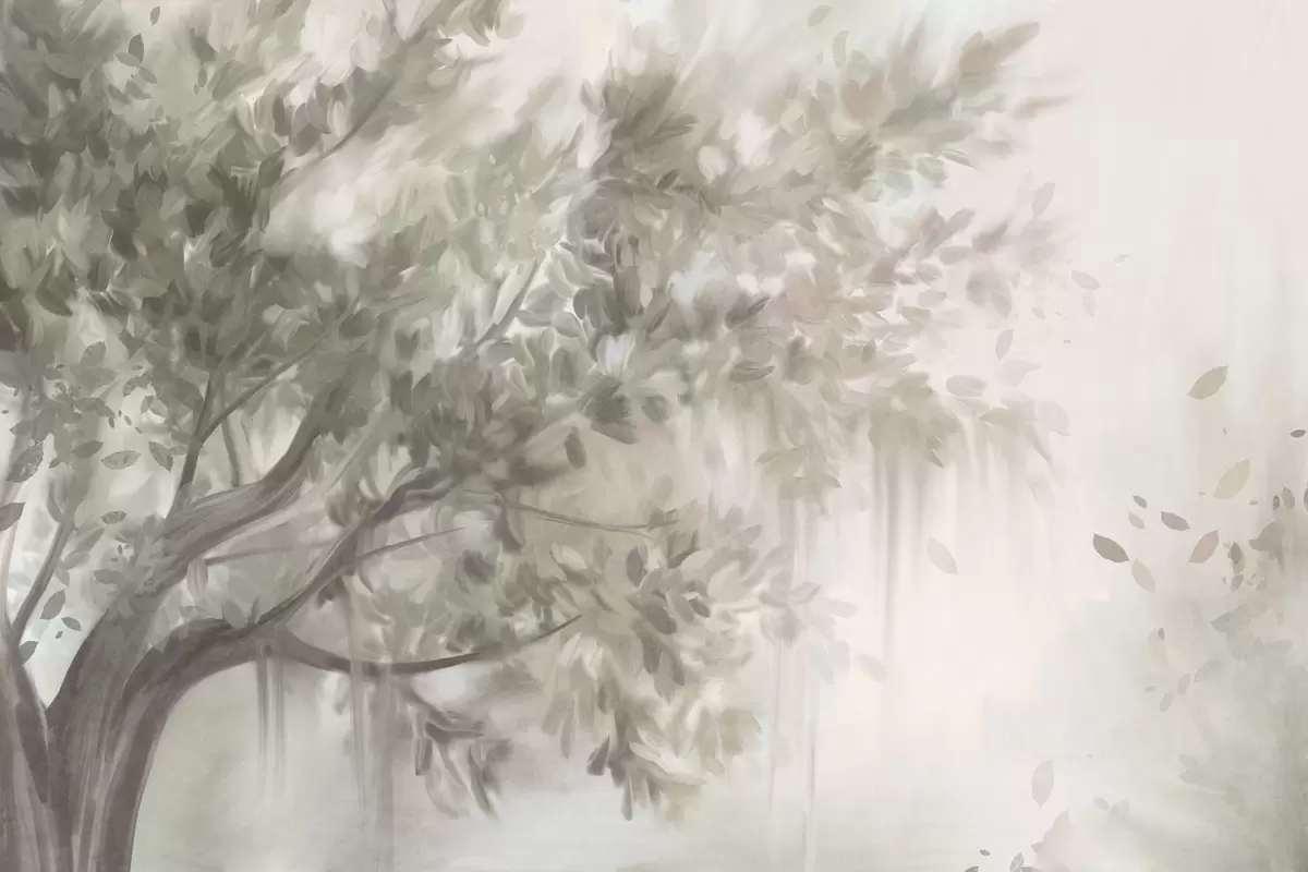 Fototapet Texturerat träd med ljusgröna blad och grenar, med en mjuk, dimmig bakgrund Nr. w09650
