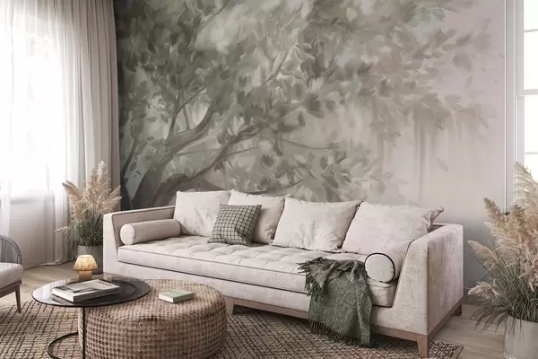 Fototapet Texturerat träd med ljusgröna blad och grenar, med en mjuk, dimmig bakgrund Nr. w09650
