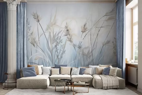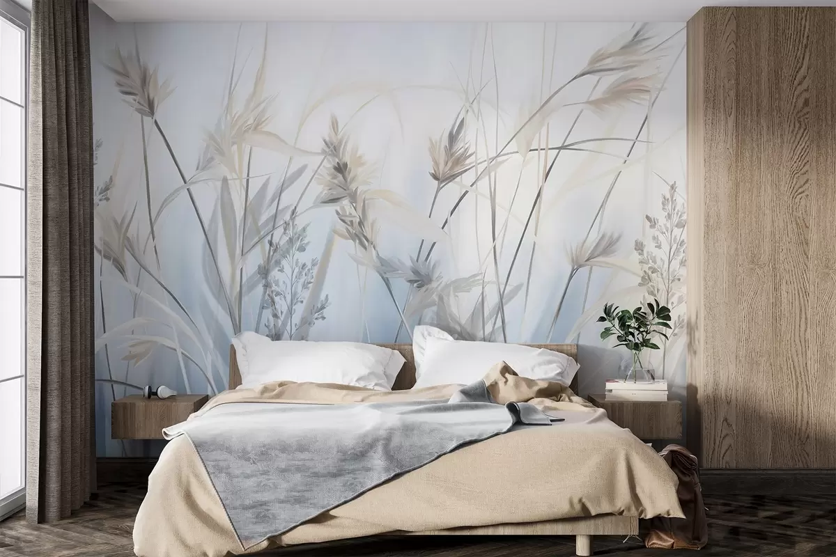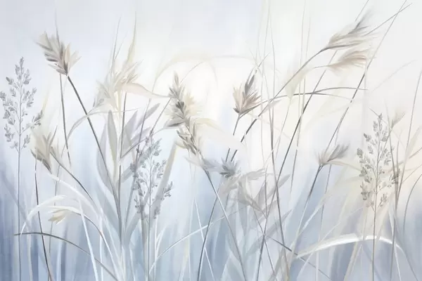 Fototapet Höga, torra grässtrån med fjäderliknande toppar i dämpade toner, mjuk, disig blå och vit bakgrund Nr. w09652