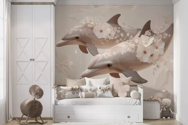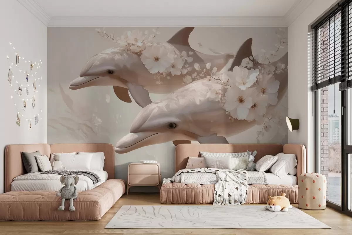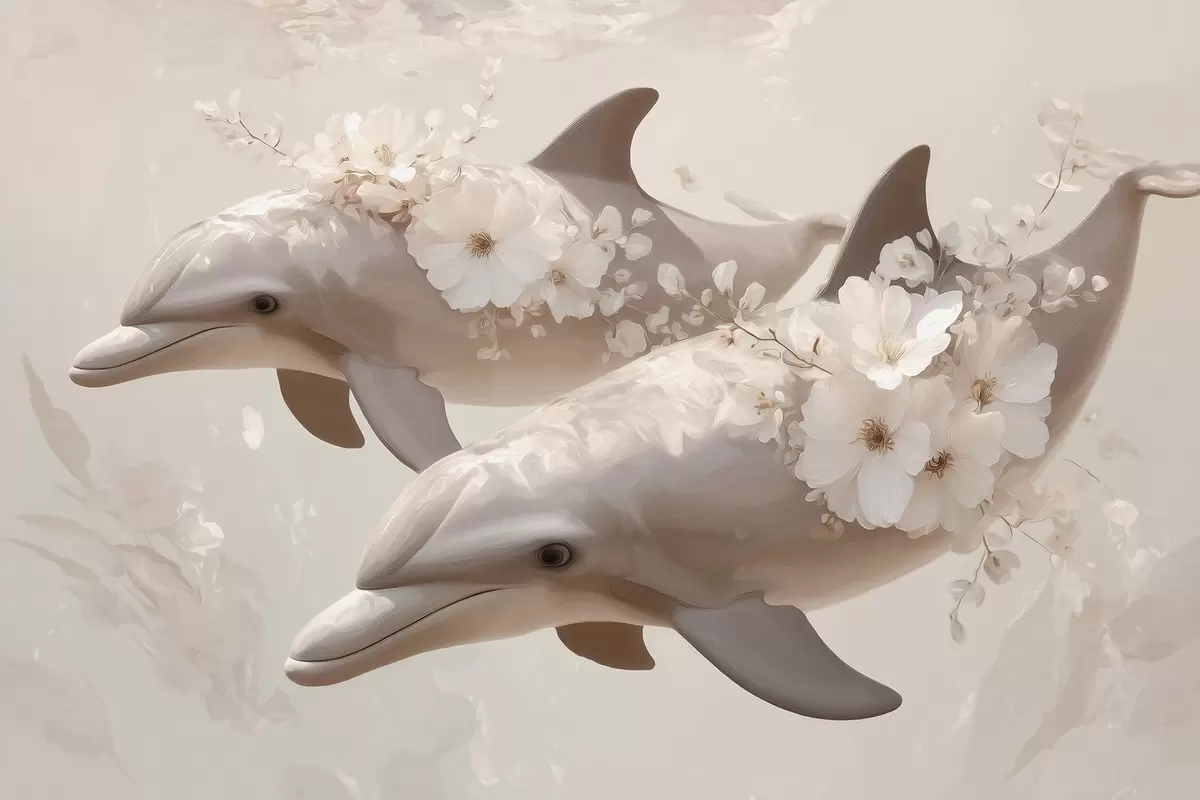 Fototapet Delfiner i ett hav av ömtåliga blommor och mjukt ljus Nr. w09666